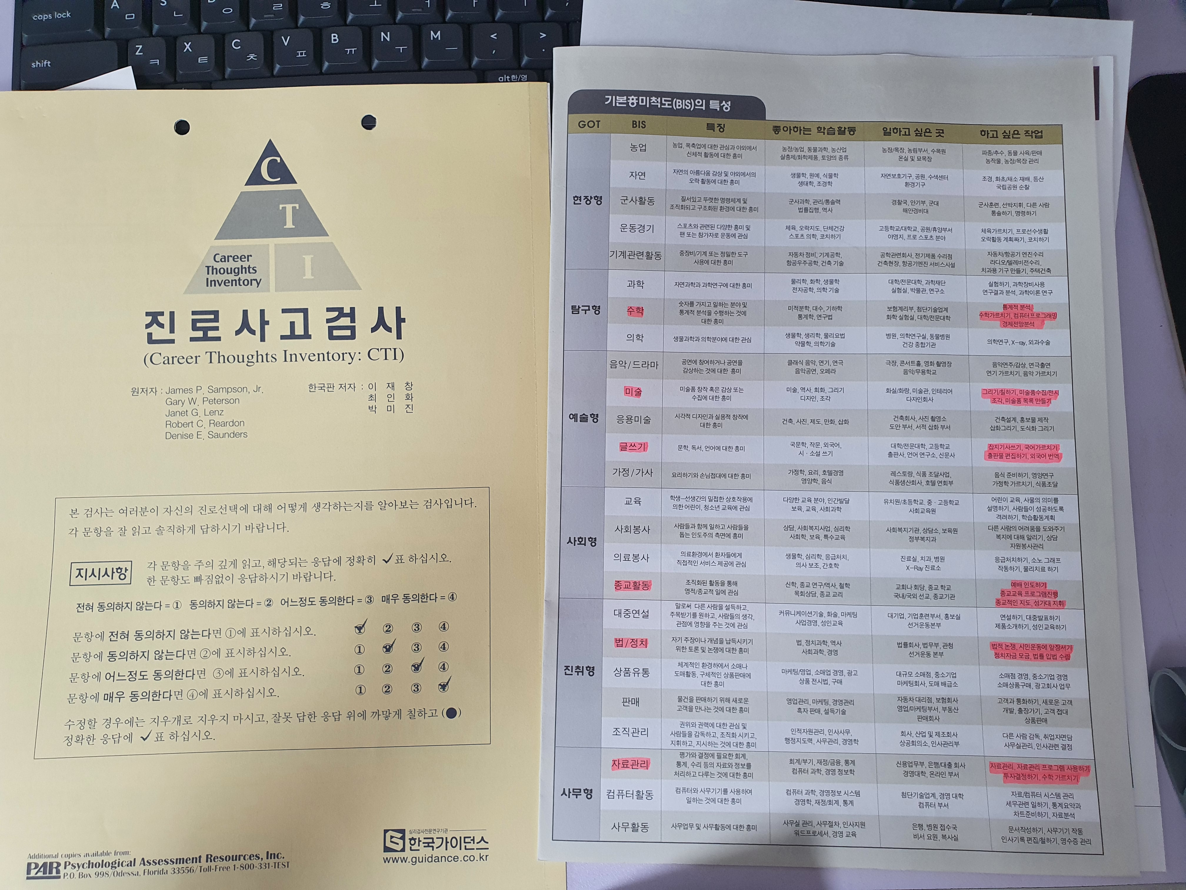 한 가지 더 검사를 진행해 주셨는데 진로 사고 검사(Career Thoughts Inventory: CTI)라는 것이었다. 조금 더 진로에 대해 구체적으로 제시해준 검사였다. 검사 결과 내가 흥미로워하는 영역들에 담당 선생님께서 형광펜으로 체크를 해주셨는데 수학, 미술, 글쓰기, 종교활동(?), 법/정치, 자료관리 등이 있었다.