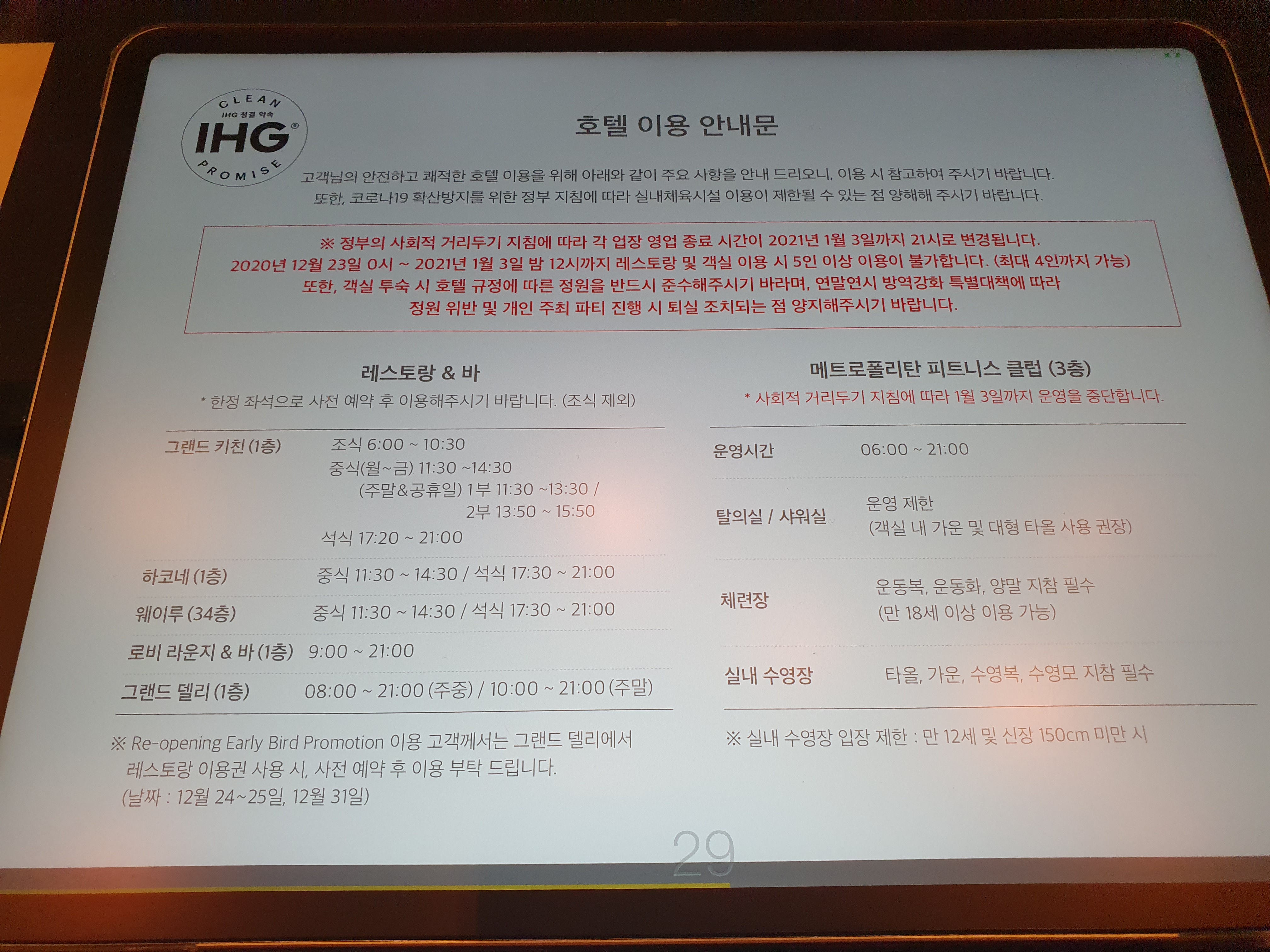 체크인을 이렇게 멋지게 패드로 진행하였다. 대부분의 이용 시설을 이용할 수 없다는 안내였다.... 하하하하..;;