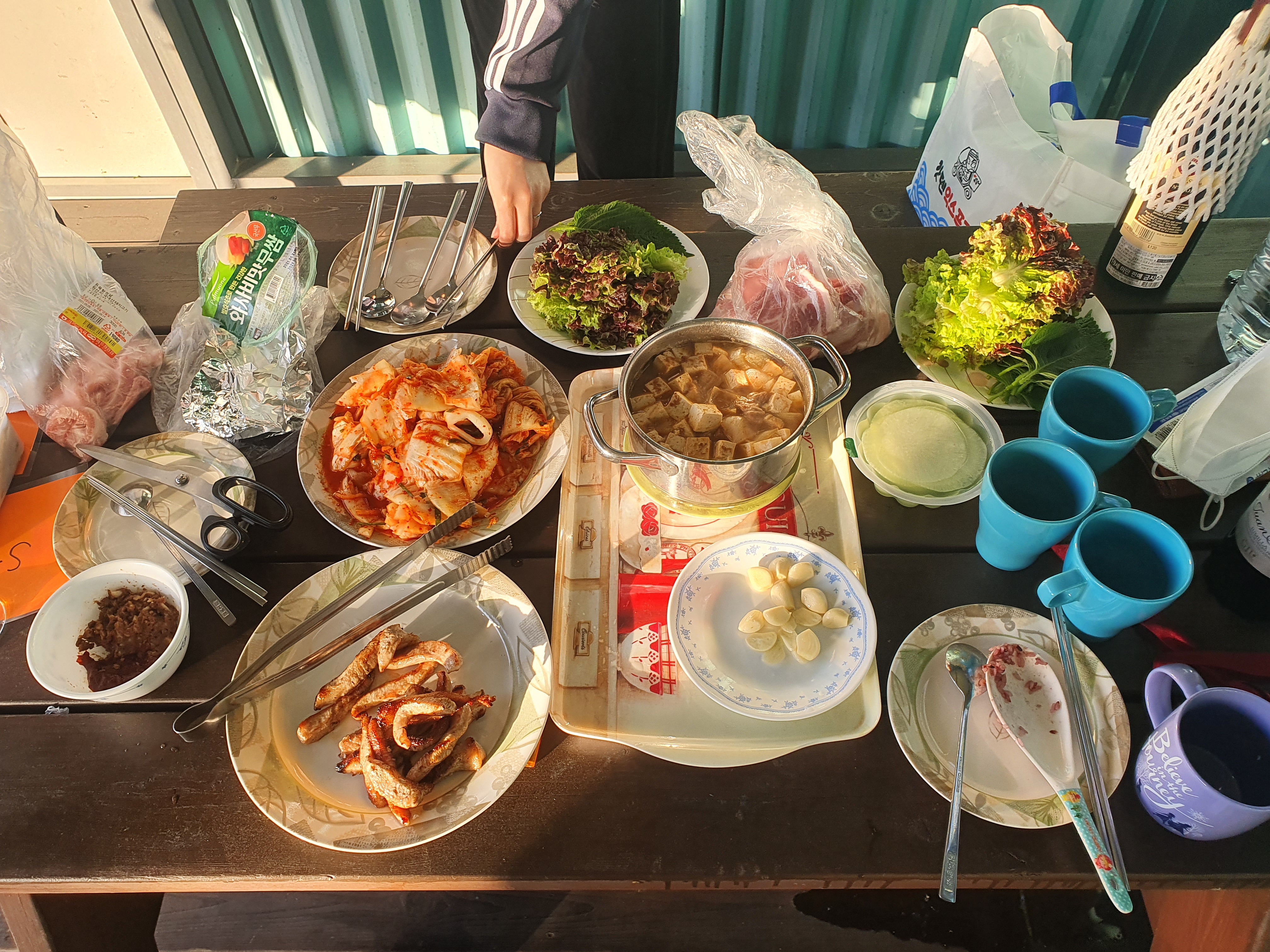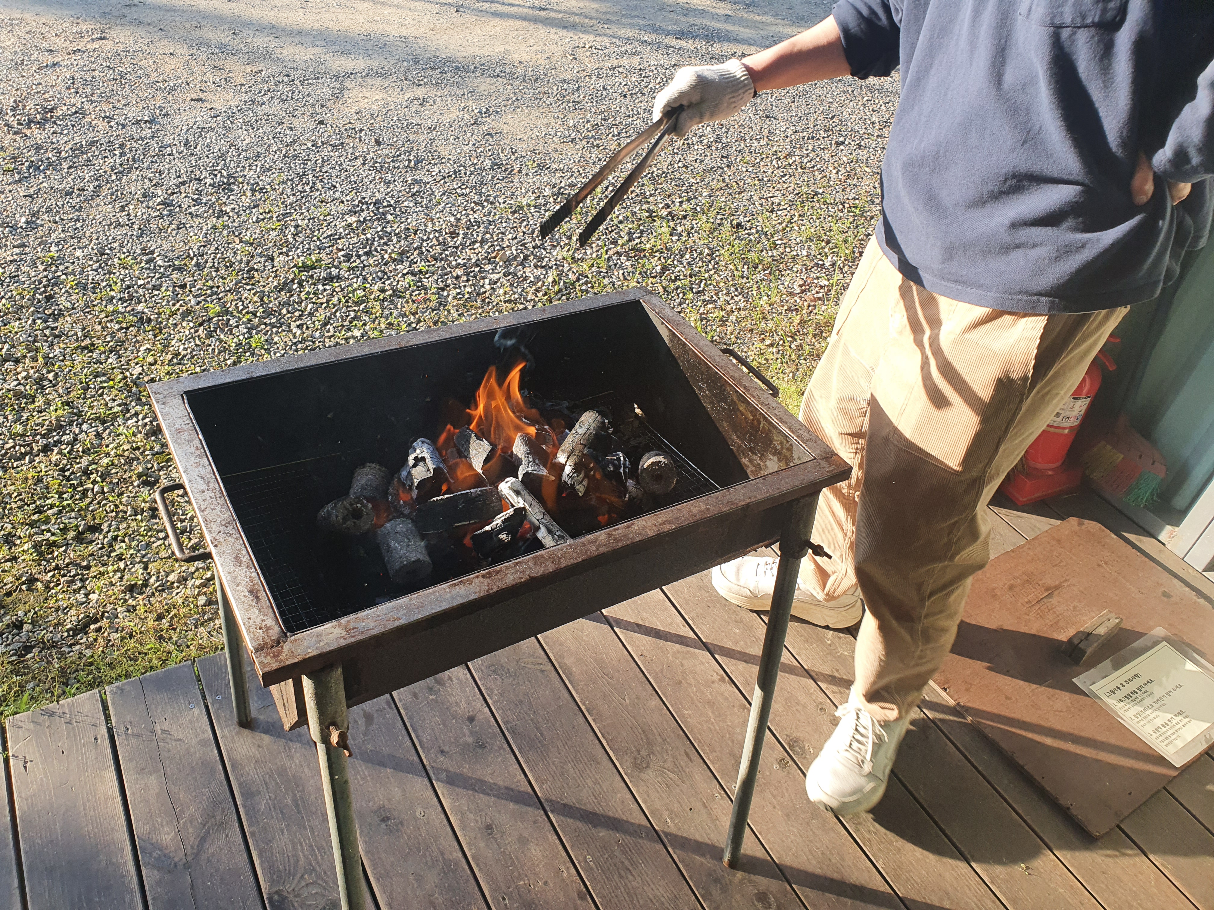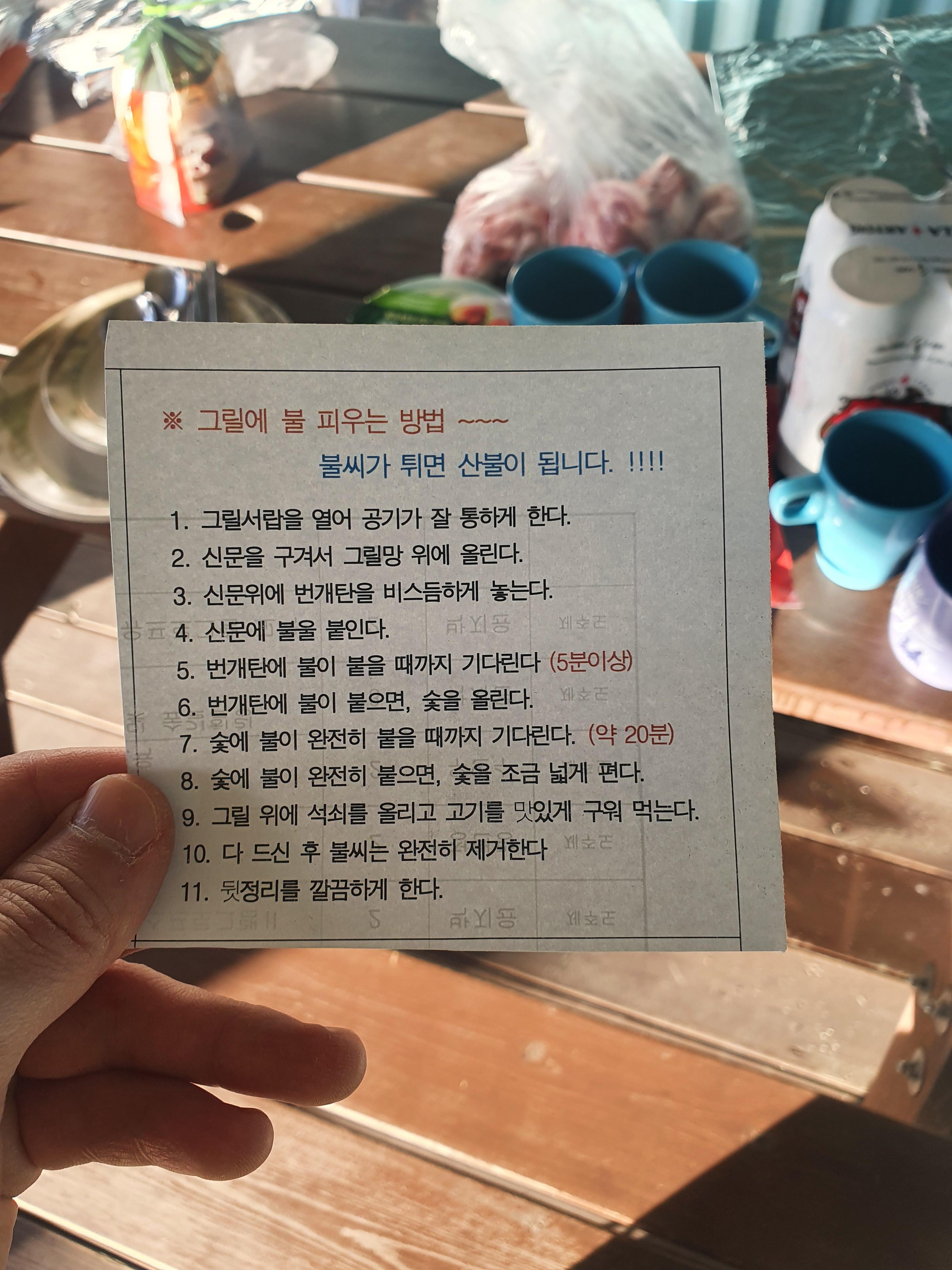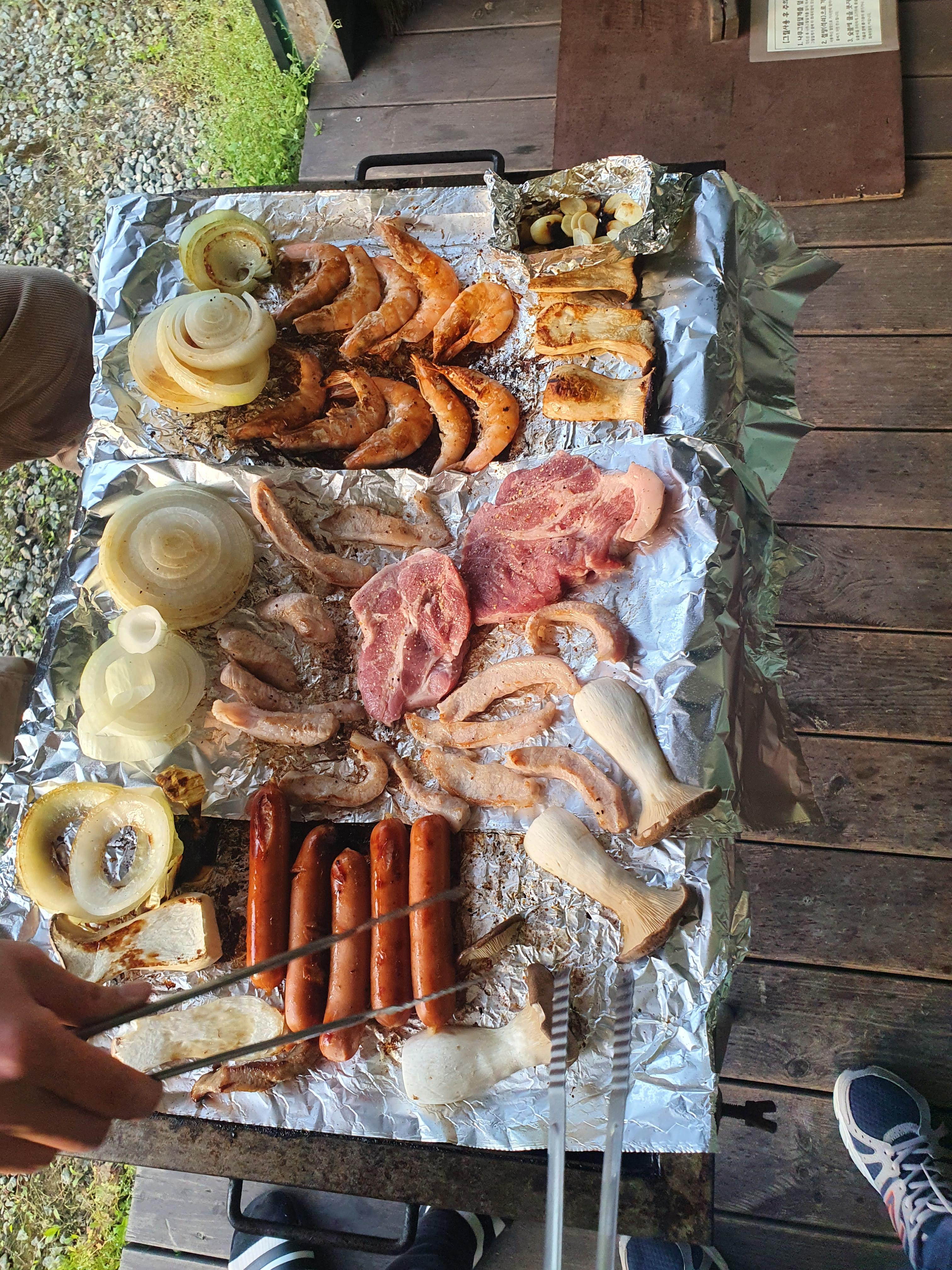 산행 후 바베큐를 시작했다. 그릴과 숯 세트 비용이 18,000원이었다. 다행히 라이터도 포함되어 있는 숯 세트였으나 라이터가 작동이 되지 않아 관리사무실에서 새로 받아야 했다..;;