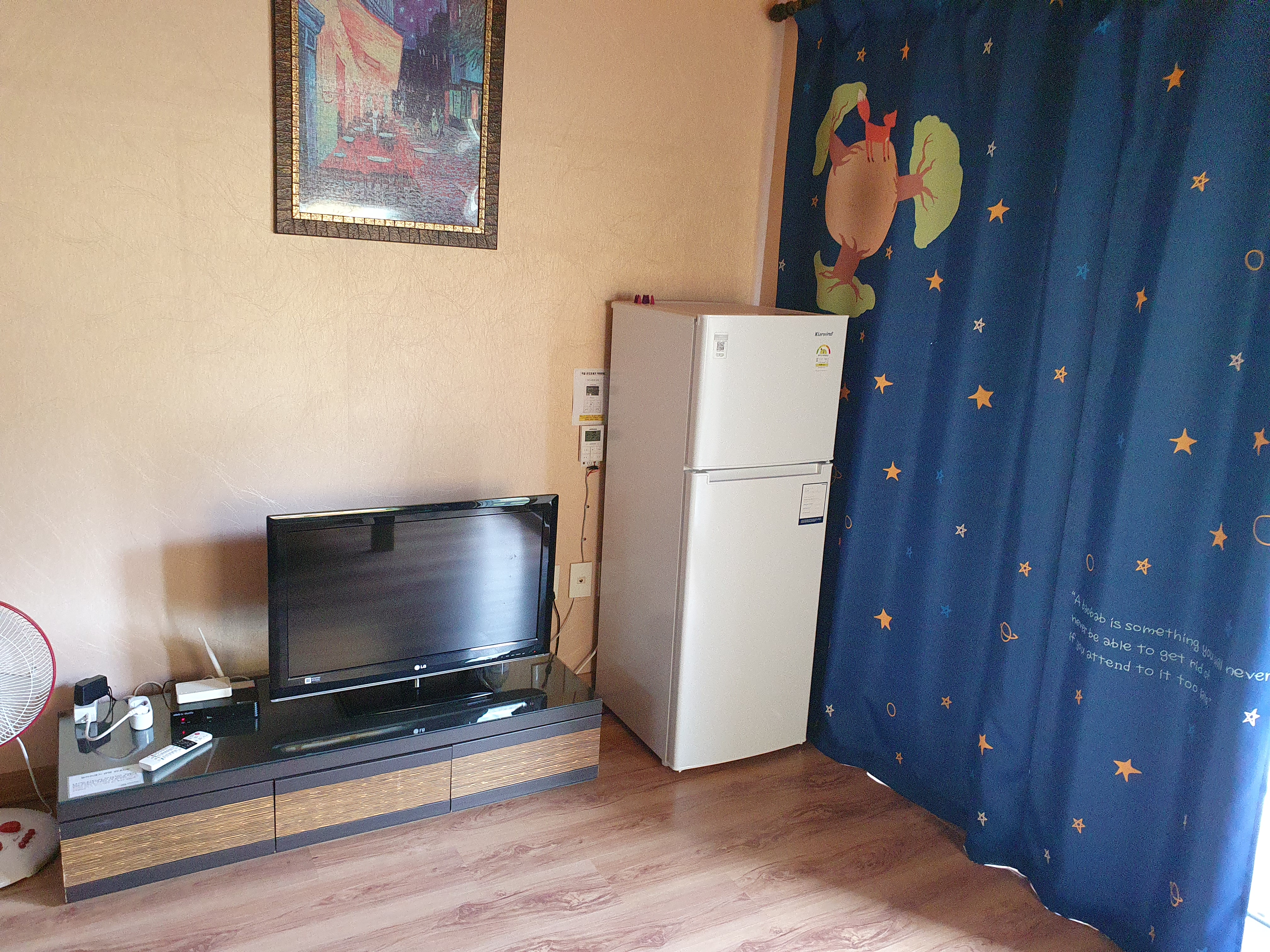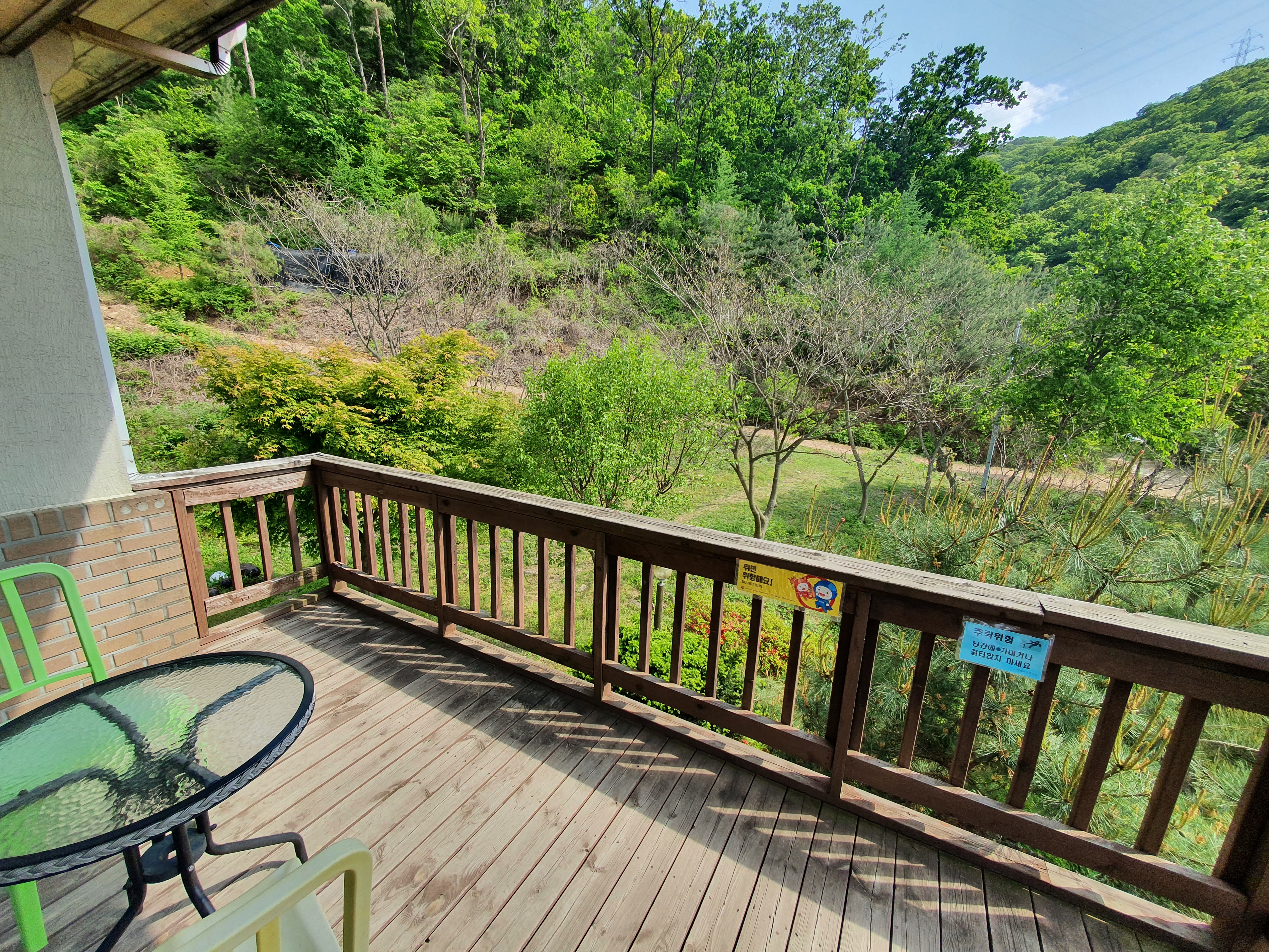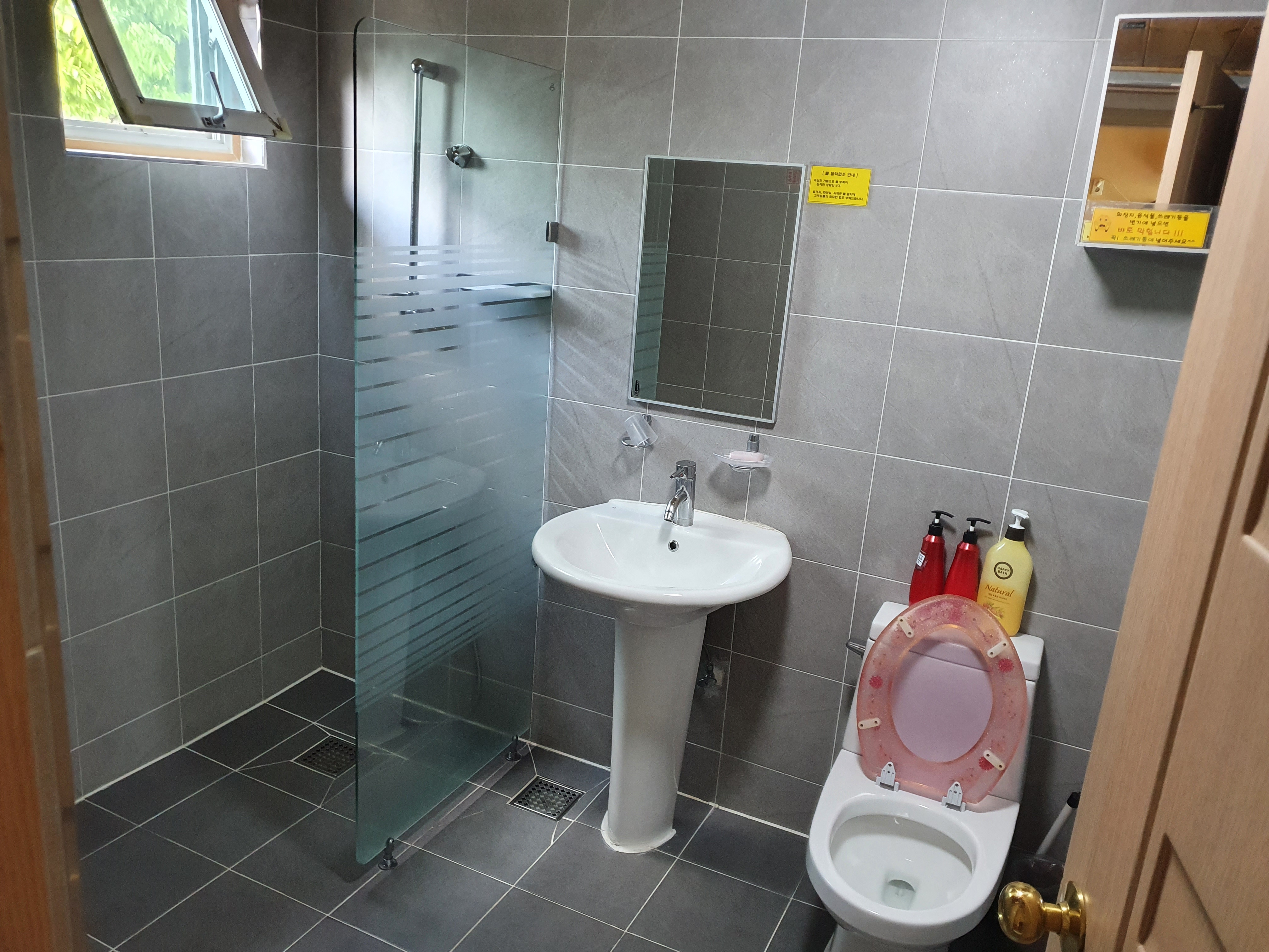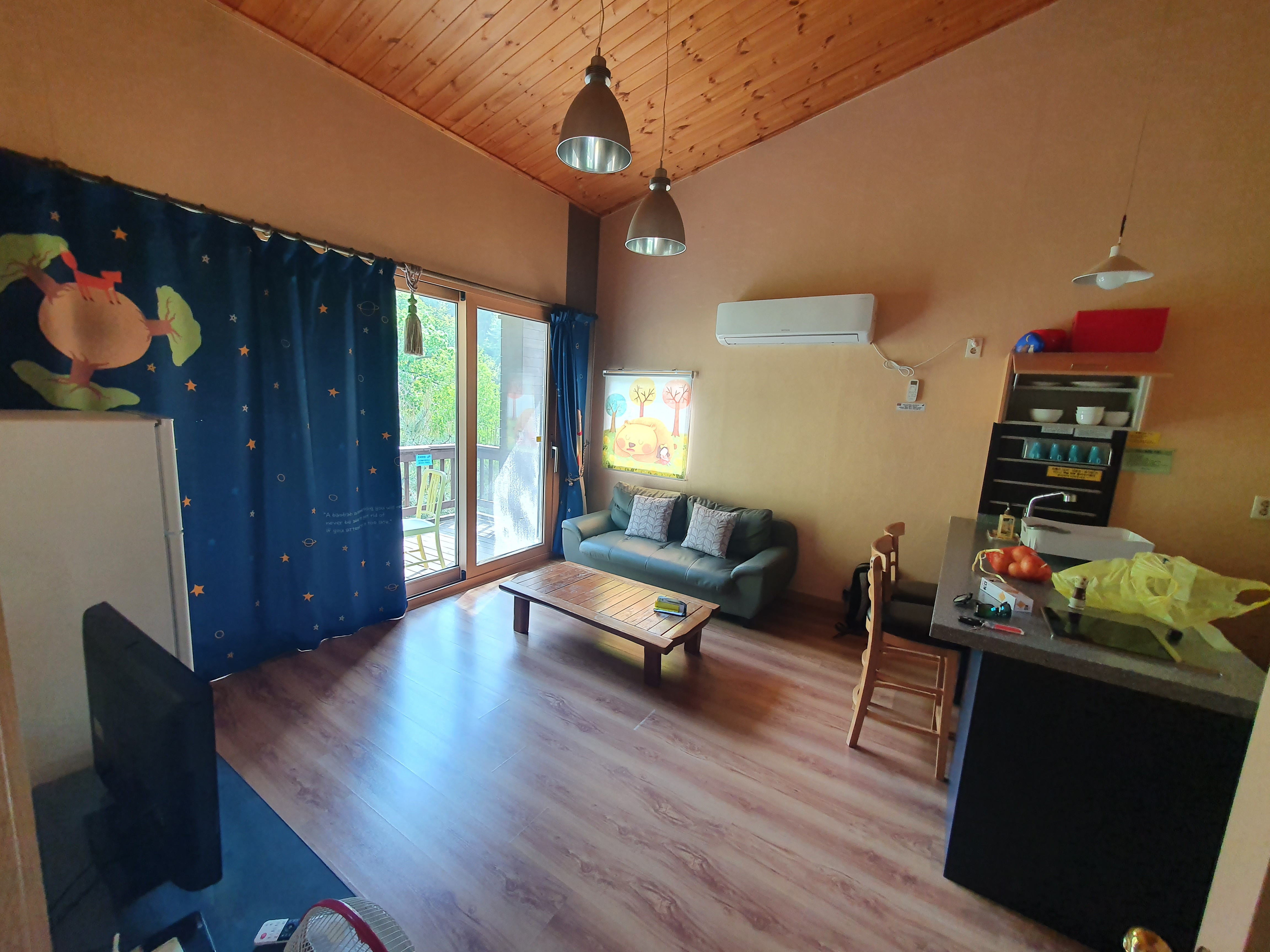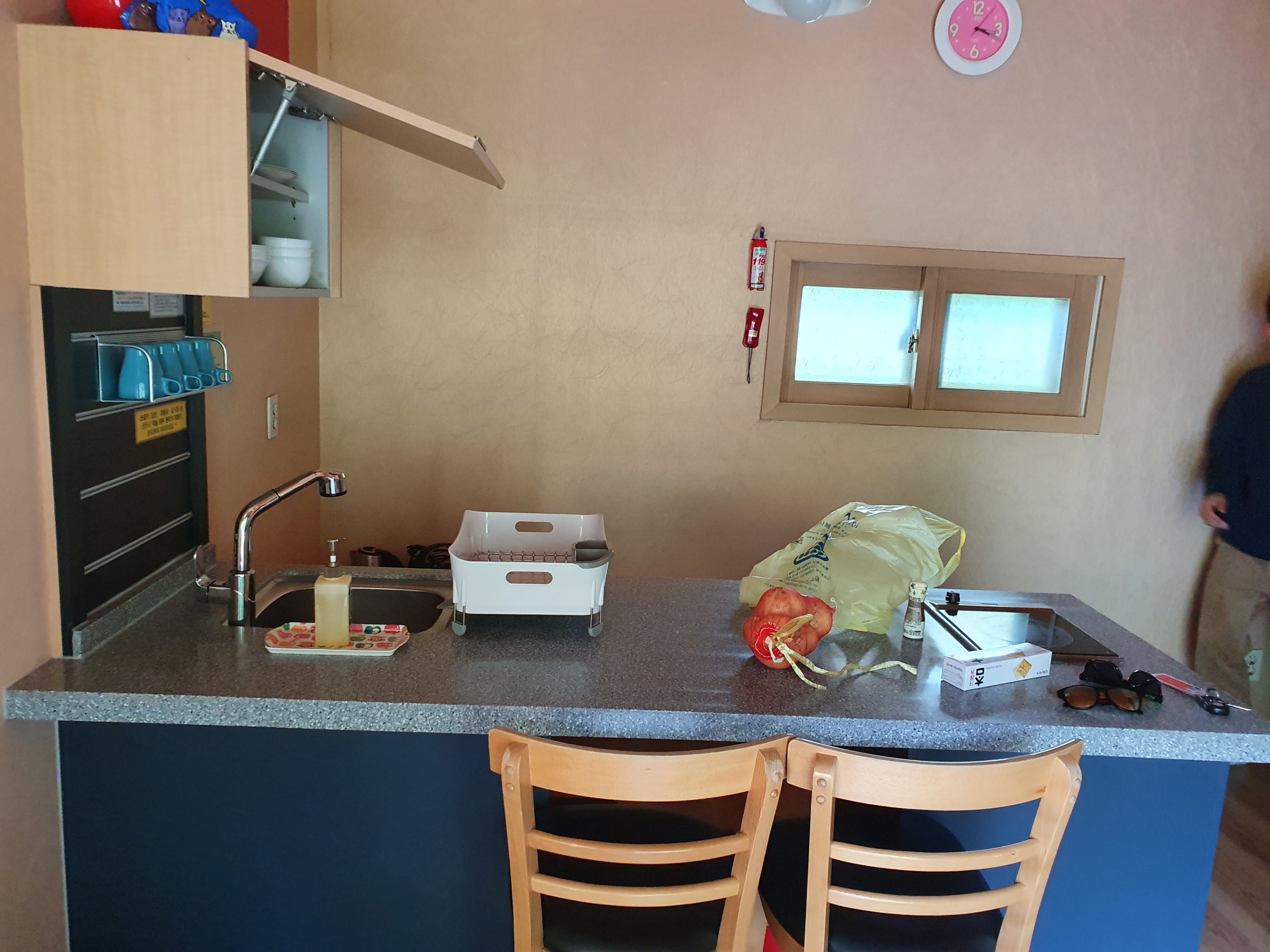주방 겸 거실! 생각보다 널찍하다. 주방에 식기도 나름 충분히 있긴 하나 여타의 펜션들과는 다르게 기본양념(소금, 후추, 기름 등)이 전혀 없고 오로지 식기와 전기밥솥, 전자레인지 정도의 조리기기들만이 존재한다. 소규모 가족 여행인 경우 양념류는 집에서 조금씩 싸오는 것도 괜찮을 것 같다.
