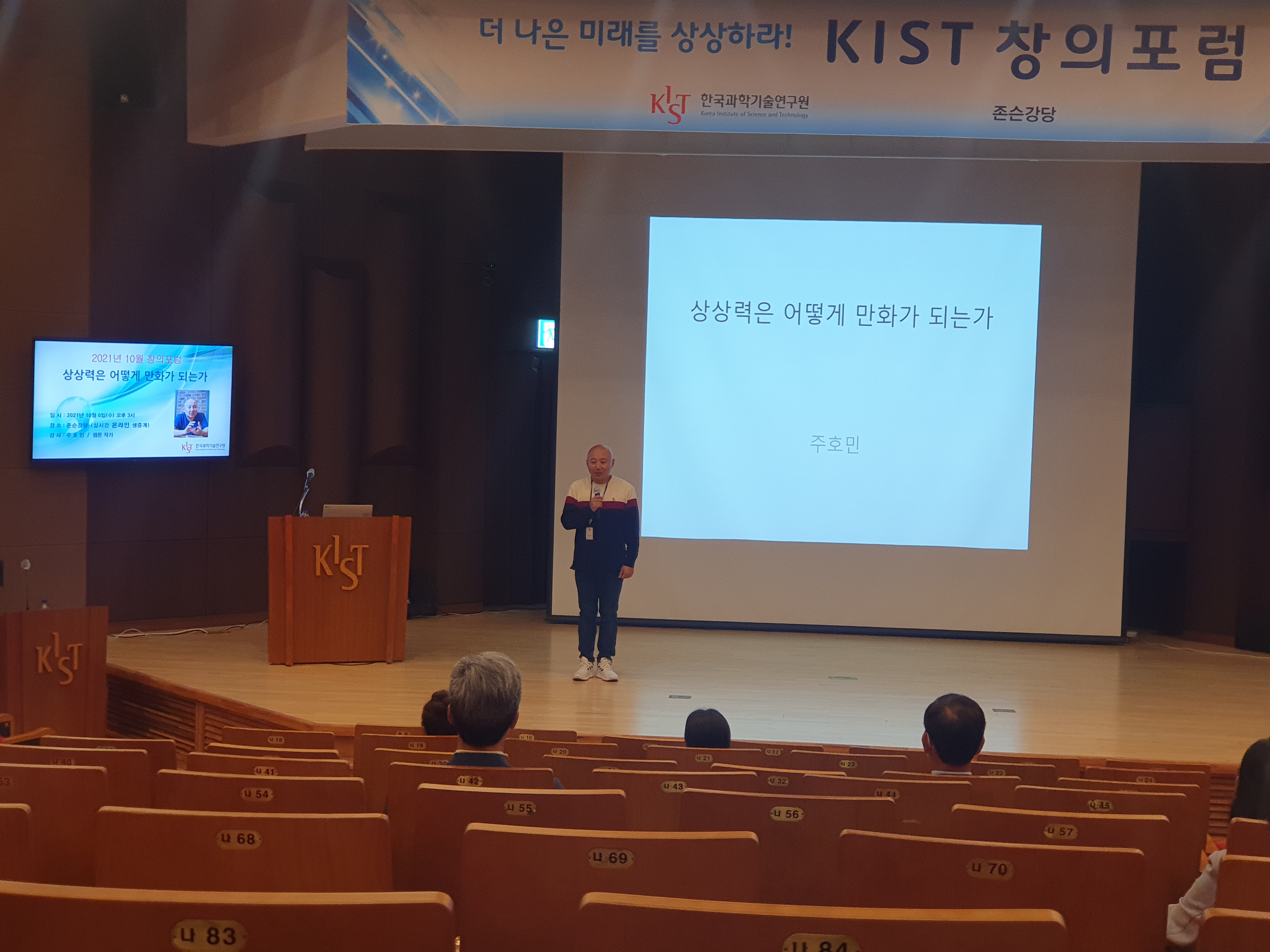 세미나 제목은 상상력은 어떻게 만화가 되는가라는 내용이었다. 하지만 실상은 주 작가님의 웹툰 일대기라고나 해야할까. 짬, 무한동력에 이르러 신과 함께가 있기까지 어떠한 과정으로 만화를 그리게 되었는지, 주펄님 방송 그대로 잔잔하게 유머를 섞어가며 얘기를 풀어나갔다. 묘하게 원장단에서 원할 것 같은 내용이 나오지 않아 걱정스럽긴 했지만 나는 정말 재밌게 들었다. 나중에 원장님이 제목과 관련된 직접적인 질문을 던지셨는데, 주 작가님은 멍 때리는 시간이 가장 중요한 것 같다고 말하였다. 확실히 현대 사회에 들어서는 생각하는 시간이 엄청나게 줄어들긴 했지..