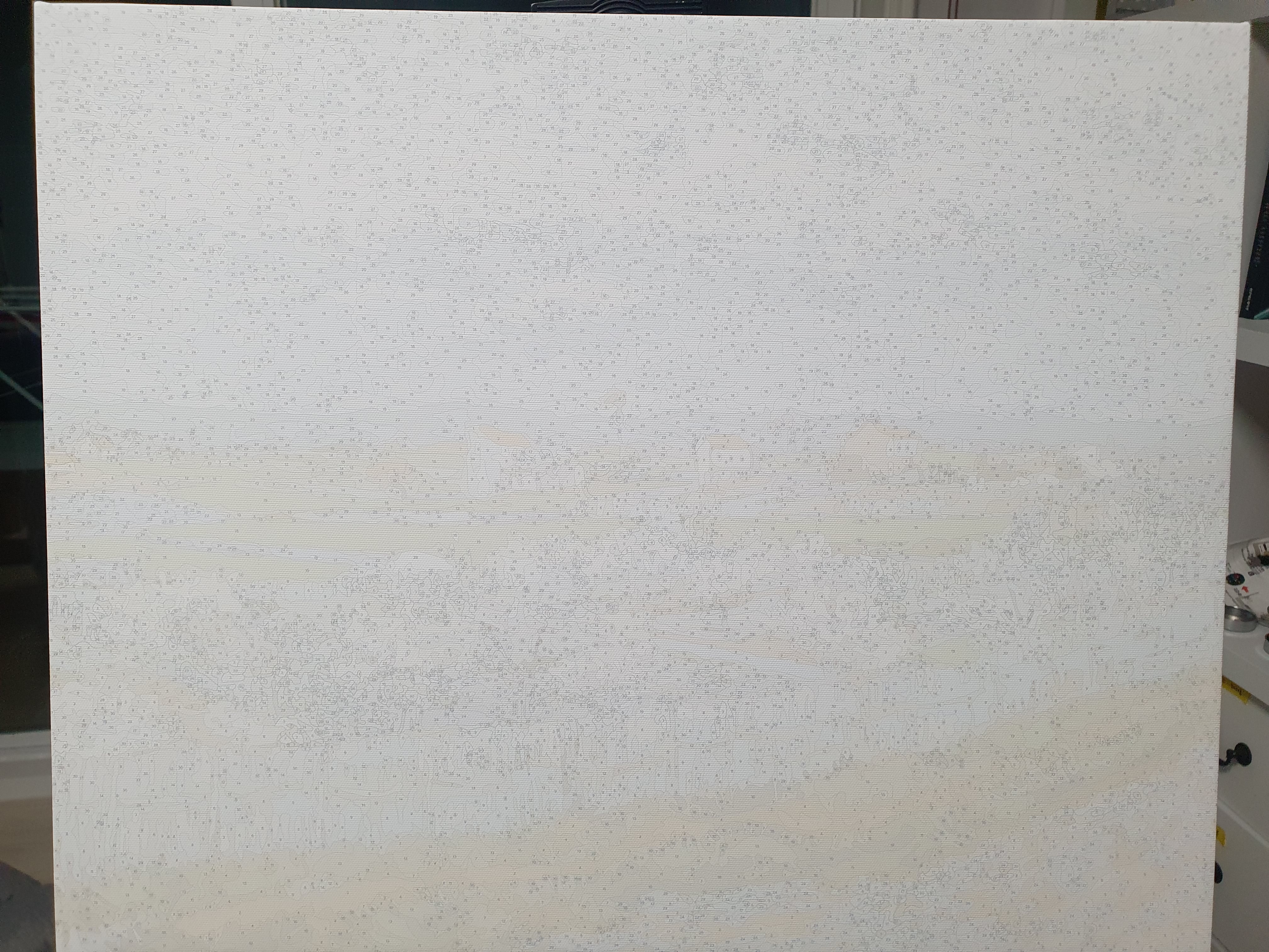 그리고 내가 칠해야 할 캔버스... 보이는 것처럼 테두리선과 숫자가 정말 희미하다. 칠해야 하는 영역의 단위가 너무 잘게 쪼개어져 있고, 숫자도 알아보기 힘들어 엄청 힘들었다. 나중에 작업하면서 알게 된 게 조명을 어떻게 하느냐에 따라 눈의 피로도가 너무 달랐다. 초반에는 이런 노하우가 쌓이지 않아 정말 일의 진척이 거의 이루어지지 않았다.