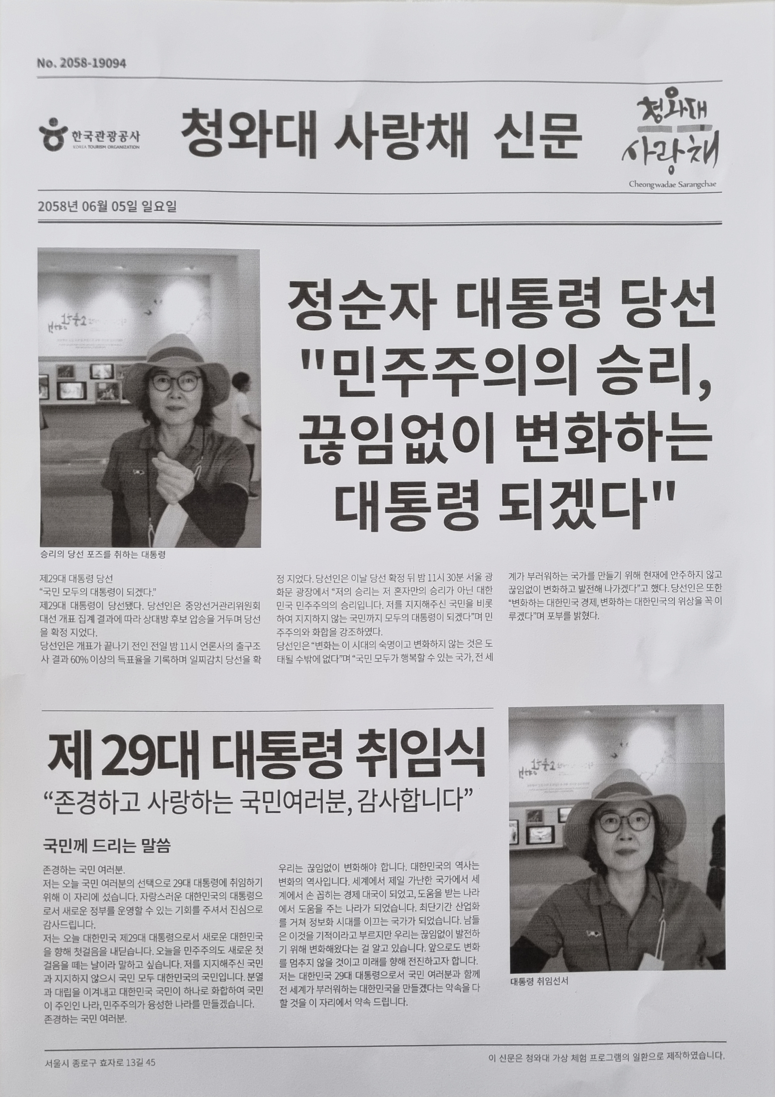 나름 재밌는 시스템이 있는데 사진을 찍으면 이렇게.. 신문으로 발행하여 인쇄/메일 보내기가 가능하다..ㅋㅋㅋ 사실 마스크를 벗으면 안 되는데 우리는 모르고 벗었다가 안내원분께 혼났다. 권력욕이 있었던 엄마는 상당히 만족해하셨다.