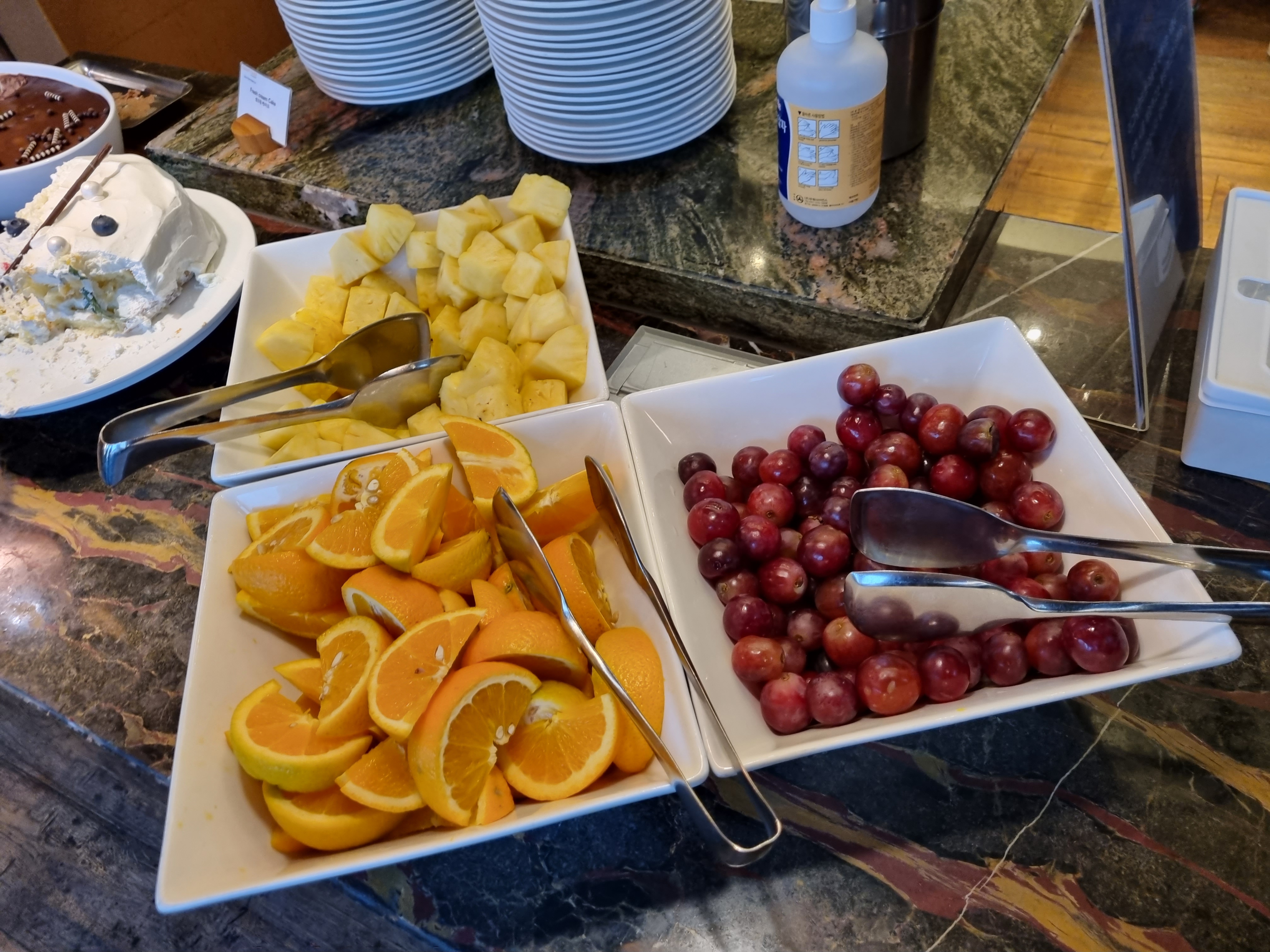 투고박스 사이즈가 생각보다 크지 않다. 뭐 딱히 배가 고프진 않아서 꽉꽉 눌러담진 않았다. 일단 과일은 오렌지, 파인애플, 포도..!