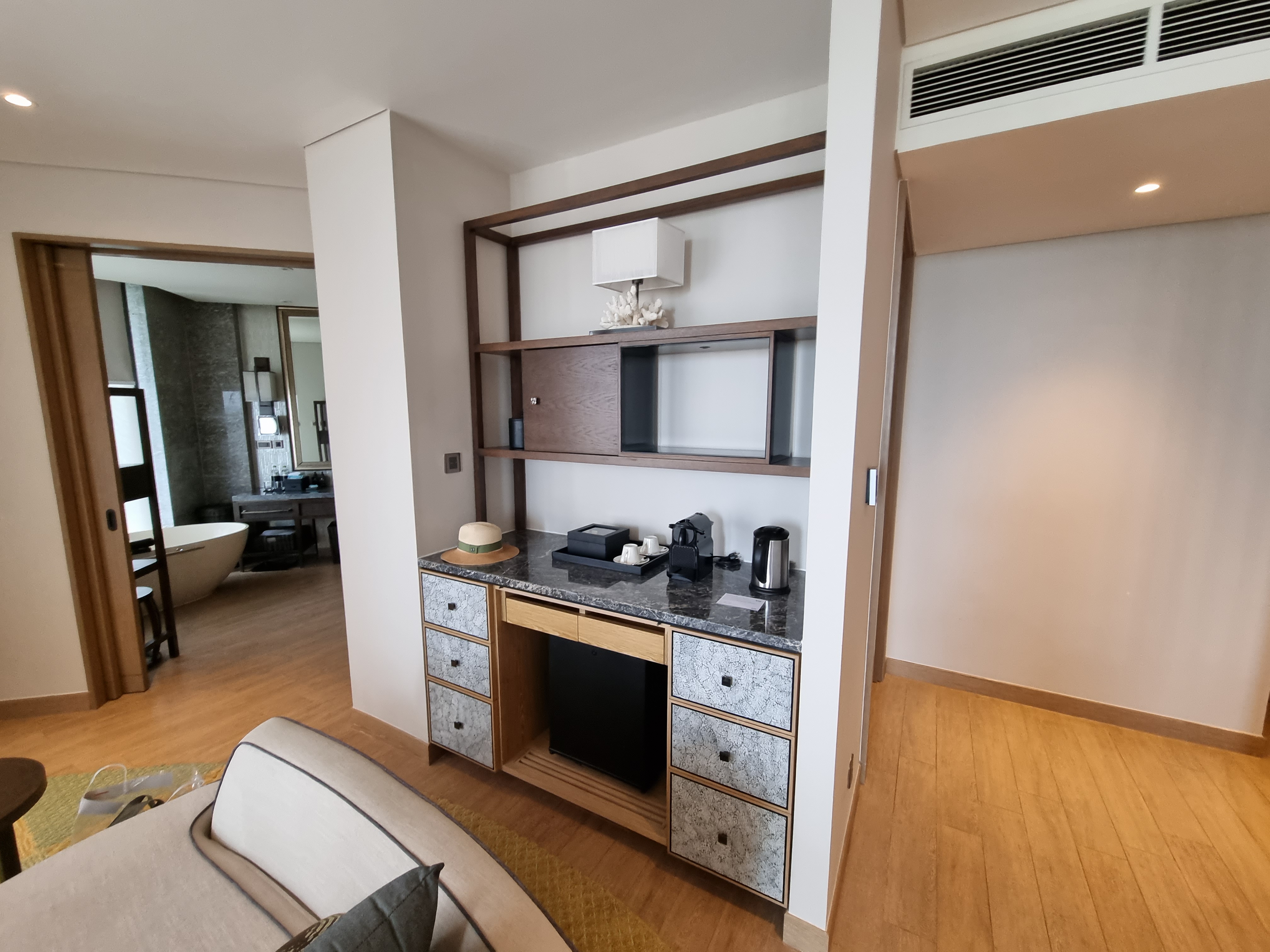 스위트룸답게 크기가 꽤나 크다. 출입문 왼쪽으로 들어서면 욕실과 드레스룸으로 통하는 문이 있다.