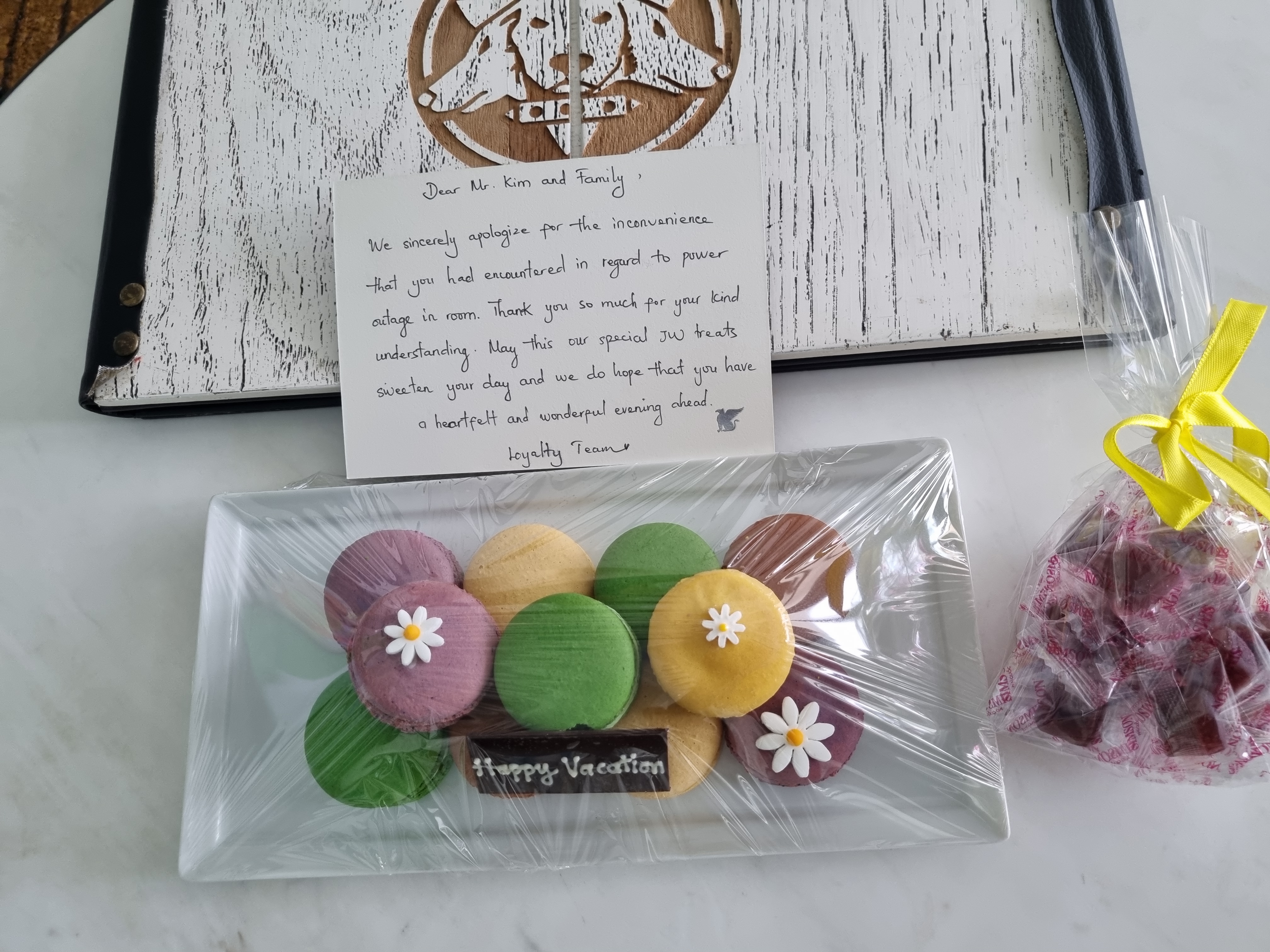 사실 우리가 머무른 기간 동안 본 건물이 한 4시간 동안 단전이 되었는데 그동안 다른 방에서 머무를 수 있도록 안내를 해주어 큰 불편함은 없었다. 다른 방에서 잘 놀고 돌아오니 우리 방에 놓여있던 마카롱...! ㅋㅋㅋ 너무 맛있었다.