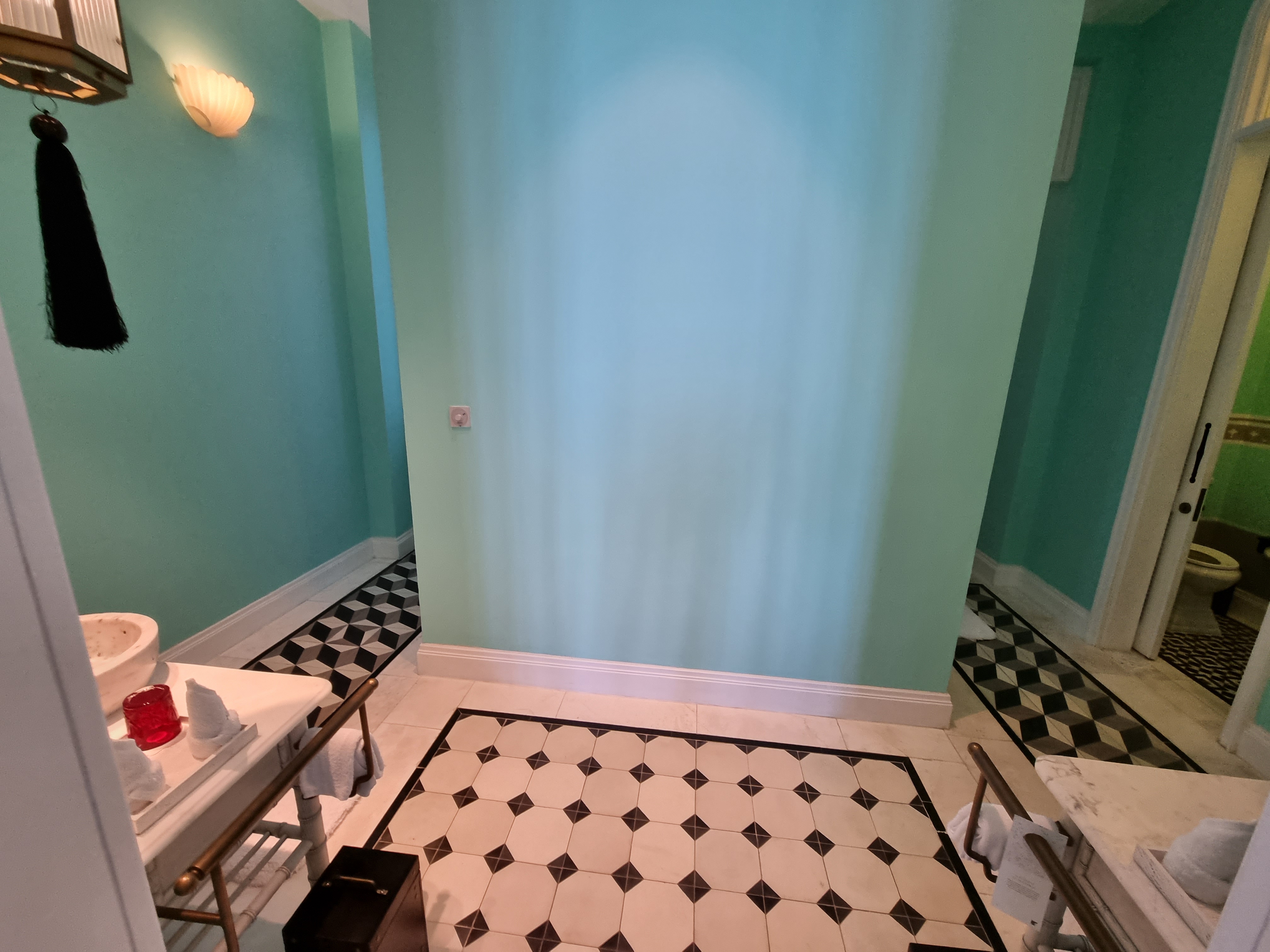 욕조 맞은편에는 샤워기도 2개가 나란히 달려있다. 사실 천정에 비처럼 쏟아지는 샤워기가 하나 더 달려있는데 찍지 못했다. 둘 다 틀어놓고 샤워를 하면 뭔가 빗속에서 샤워하는 느낌이 들어 좋았다. 두 샤워기의 물 온도를 미묘하게 달리해서 온탕 냉탕을 번갈아가는 느낌으로 샤워를 몇 번 했다..ㅋㅋ