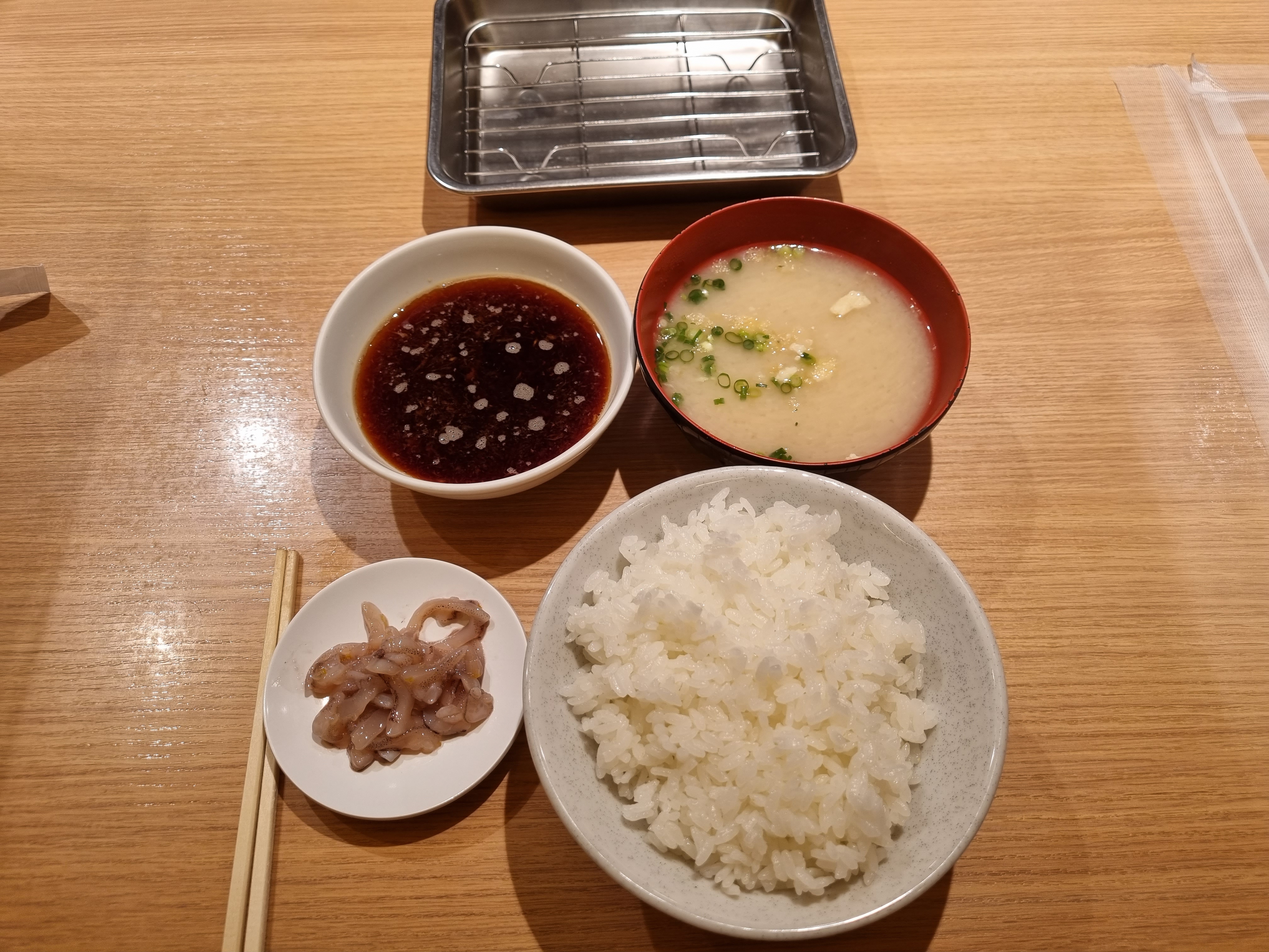 밑반찬으로 주는 오징어젓갈! 유자같은 게 올라가 있어서 신선한 느낌이었다. 오징어 특유의 비린 맛이 세진 않아서 괜찮았으나 원래 오징어를 좋아하진 않아서 많이 먹진 않았다. 우리 옆에 앉아 계시던 일본 분은 계속 리플을 해서 먹더라. 일단 무료로 계속 제공하는 반찬인가 보다.