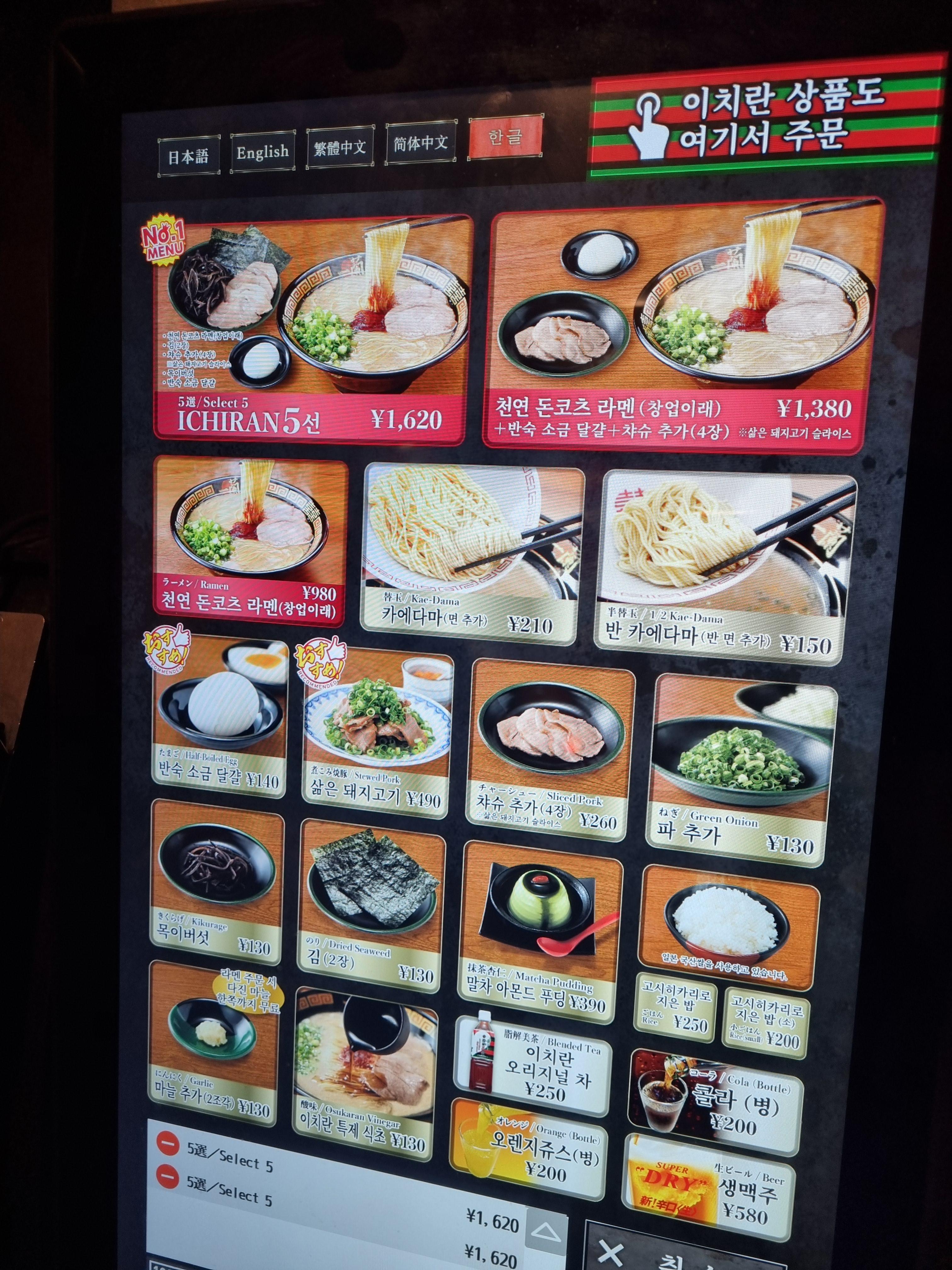 주문은 여기 키오스크에서..!! 예전에 말고기와 왔을 때는 가장 싸게 먹었지만 이번에는 이치란 5선으로 주문해 봤다.