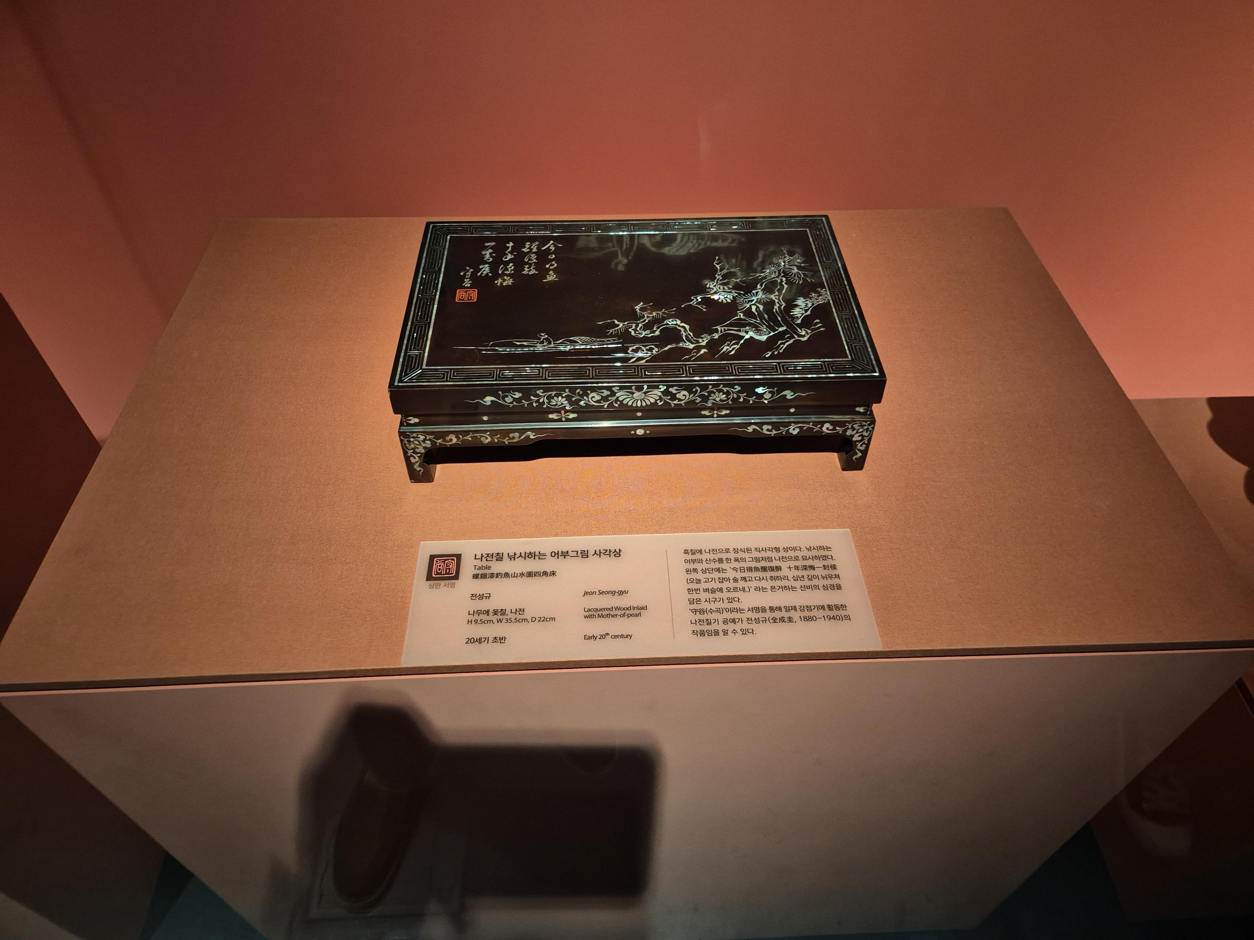 엄청 예뻐 보이는 것들만 몇 개 찍어봤다. 나전칠기에서 나전칠이라는 게 조개나 전복 껍데기에 보면 반짝거리는 녀석이 있는데 그걸 이용해 옻칠을 한 기물에 새겨 넣는 작업을 뜻한단다. 아하 자개장이나 그런데 보이던 반짝반짝한 녀석이 조개껍질에서 나온 녀석이었구나..!