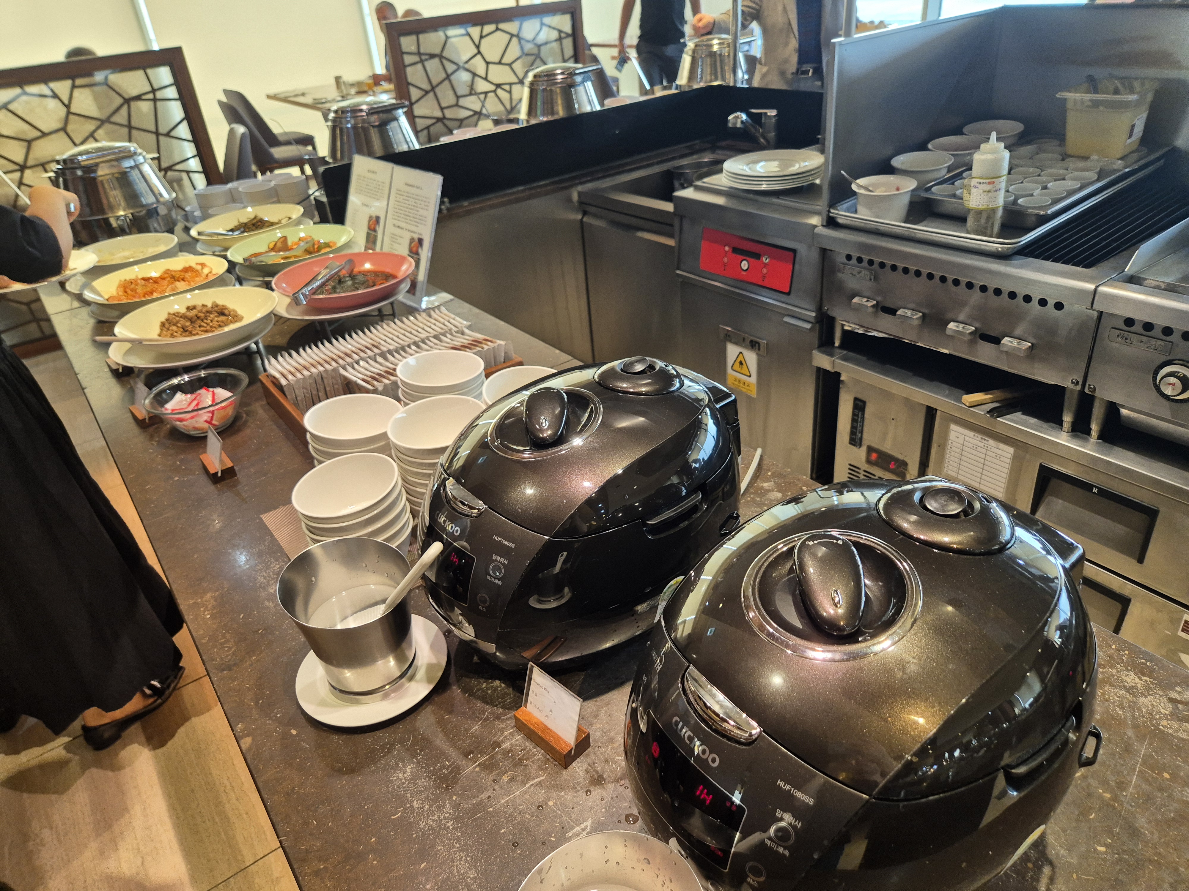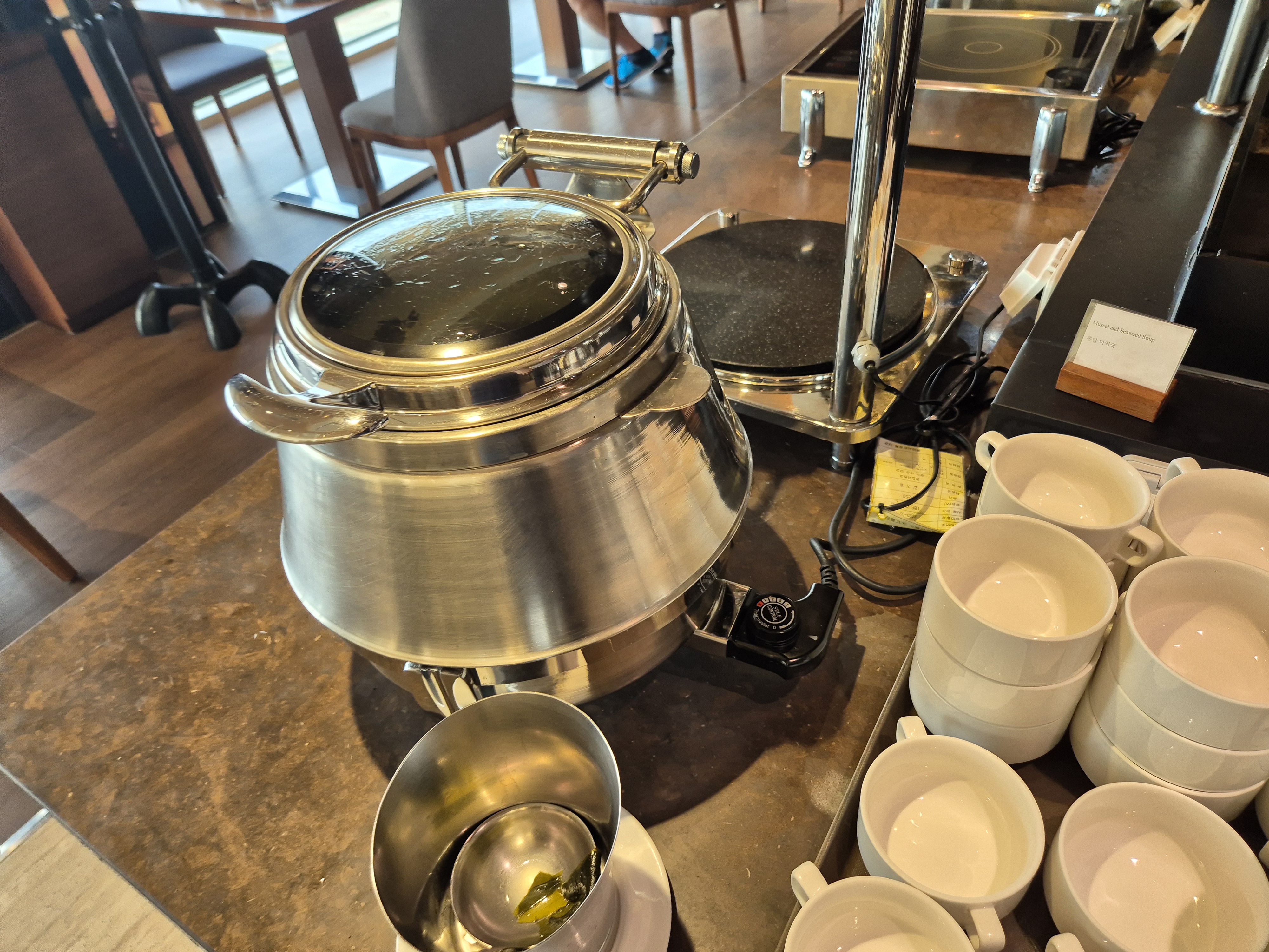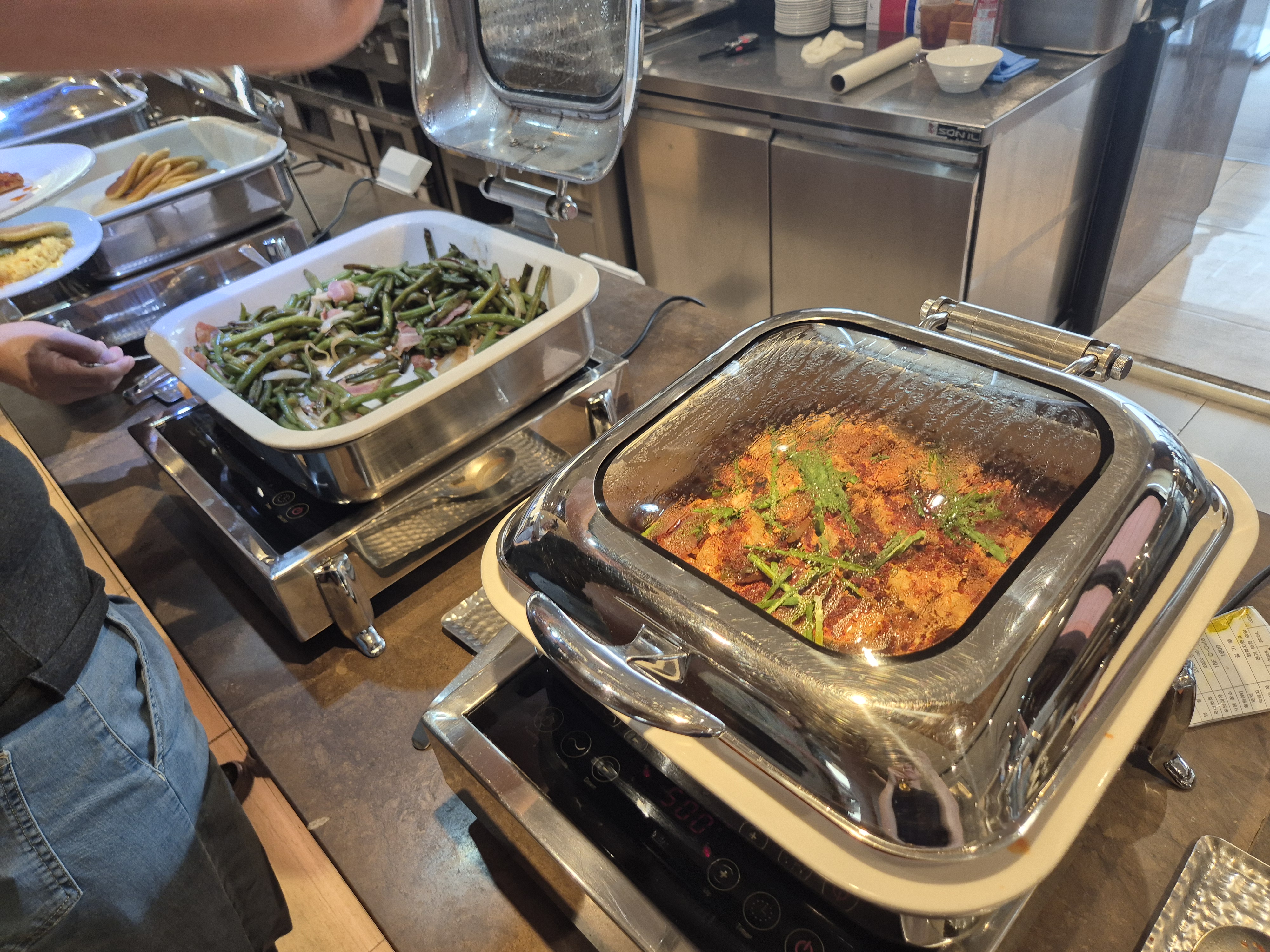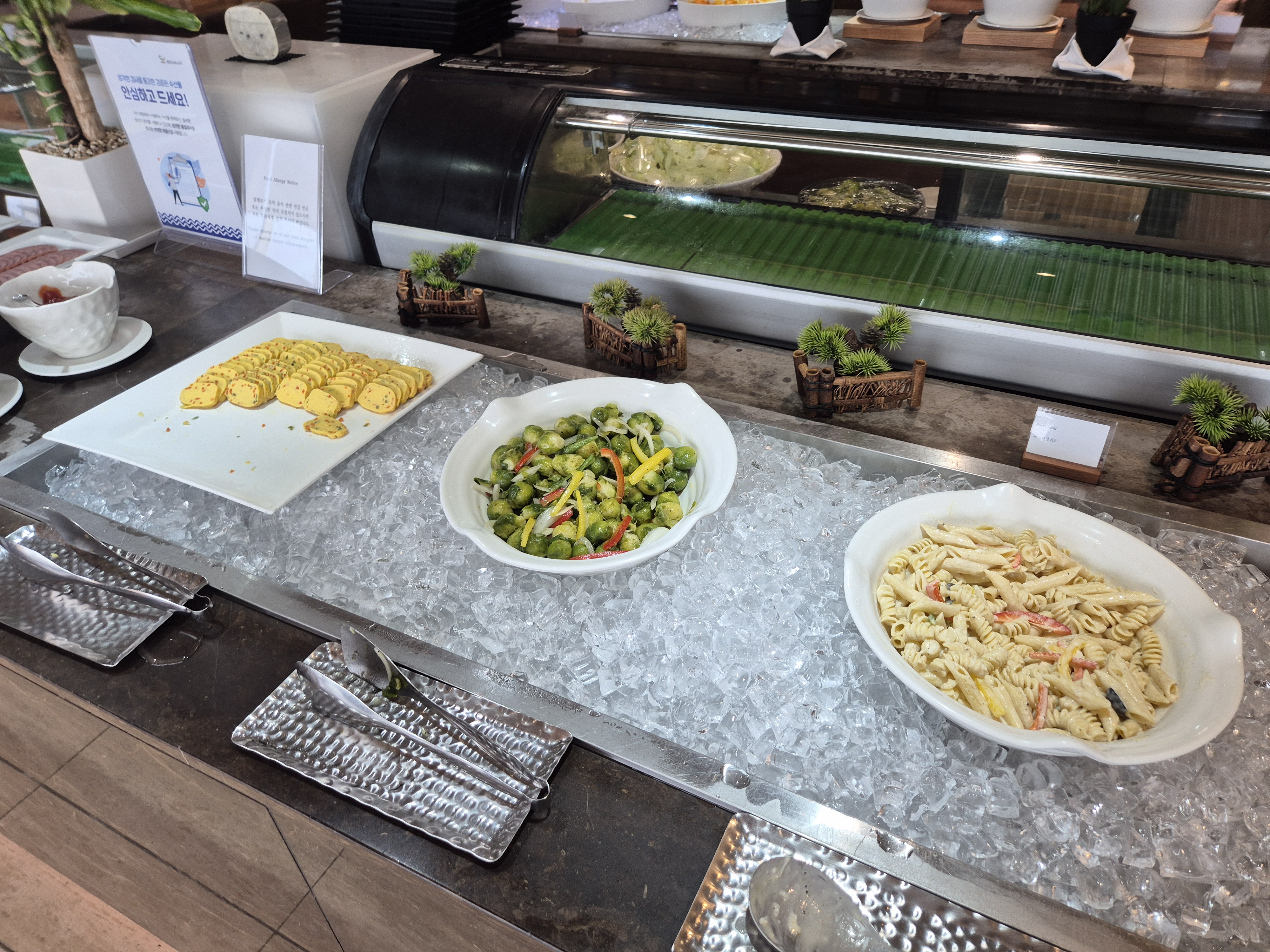 다들 늦게까지 얘기를 나누고 잠이 들었지만 일찍 깨신건지 조식당에서 다 만나버렸다..ㅋㅋ 조식당은 꼭대기층에 있어 전망이 좋긴 한데 우리는 여러 명이 같이 앉아야 하다 보니 저 구석자리에 앉았다. 그래도 메뉴는 다 찍어야겠다는 일념하에 사진부터 열심히 찍었다.