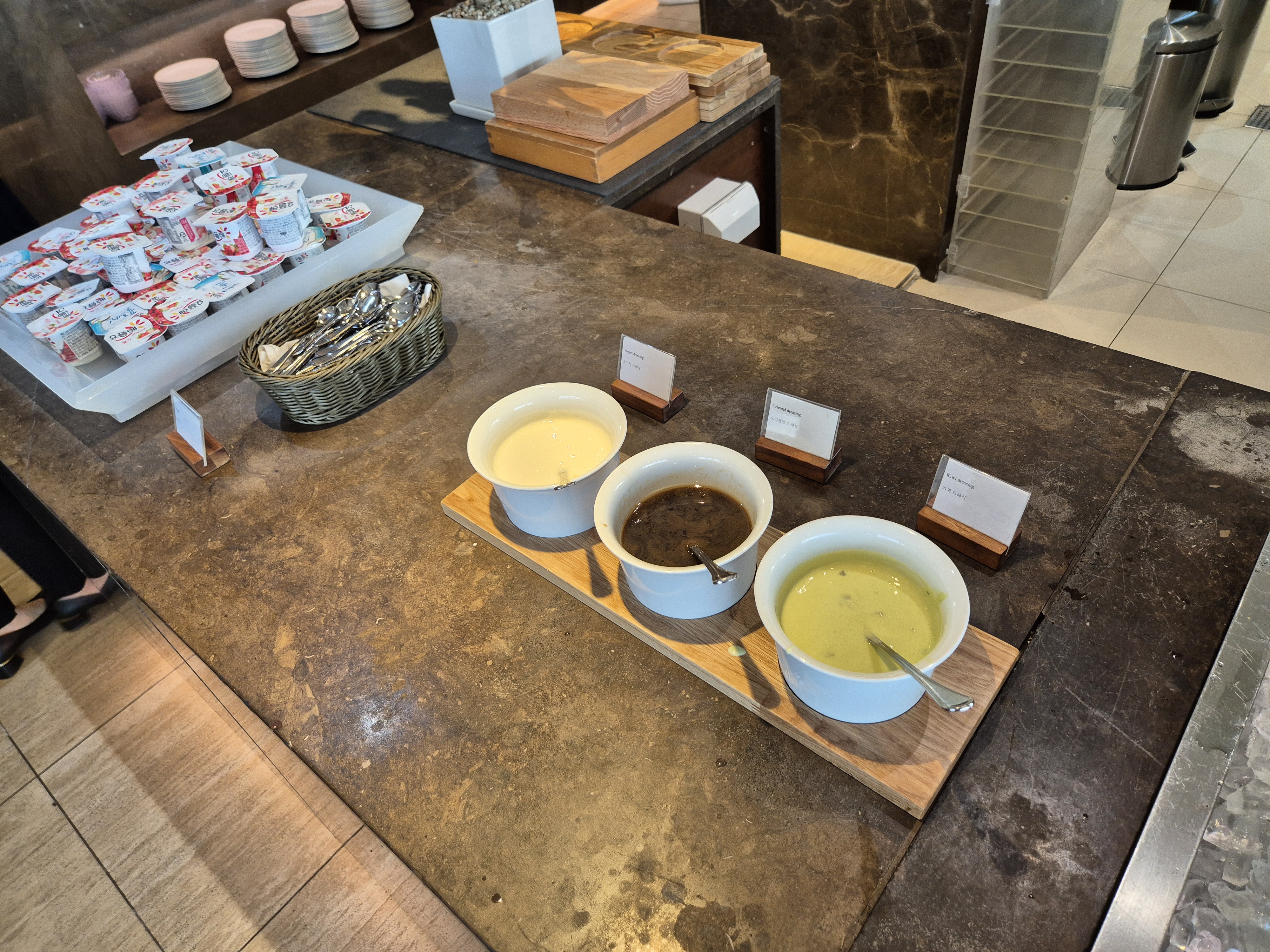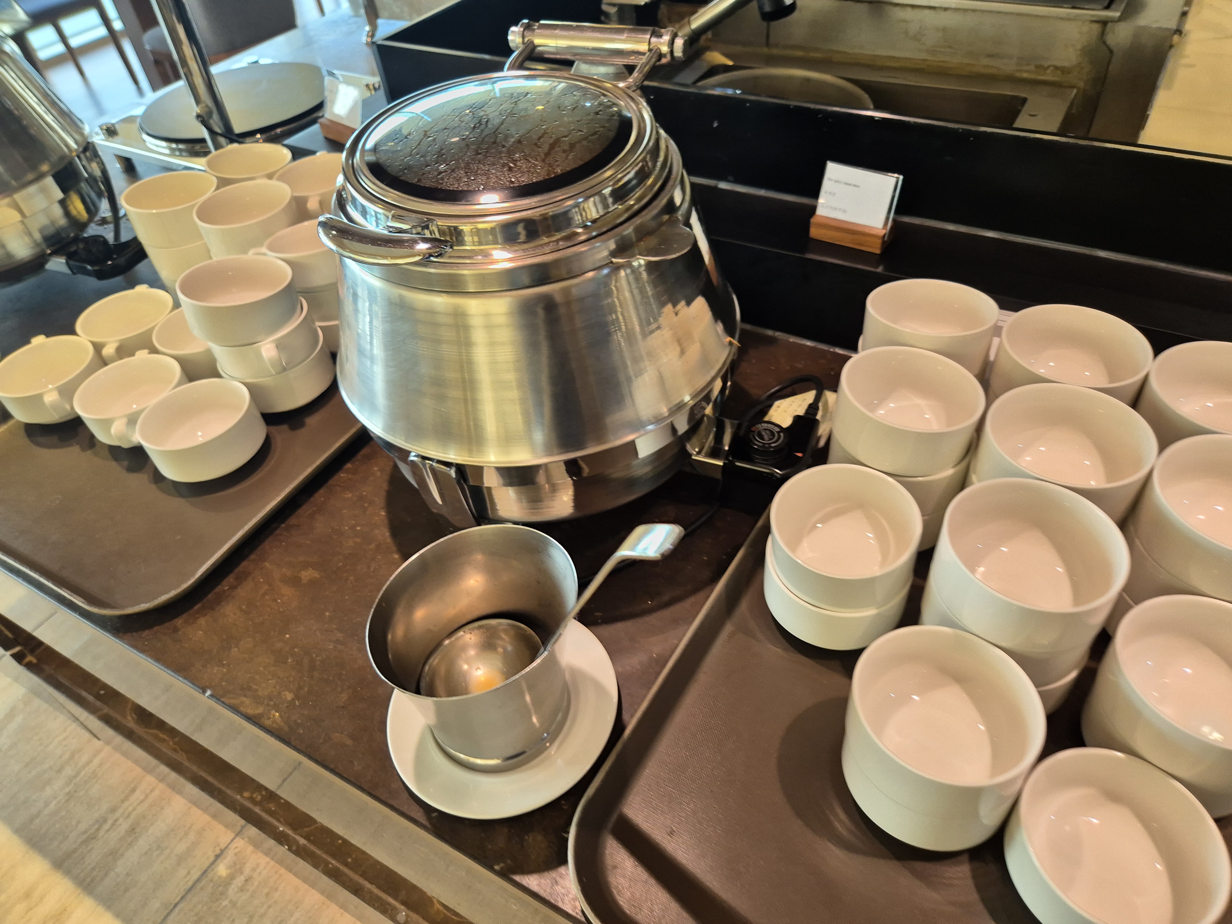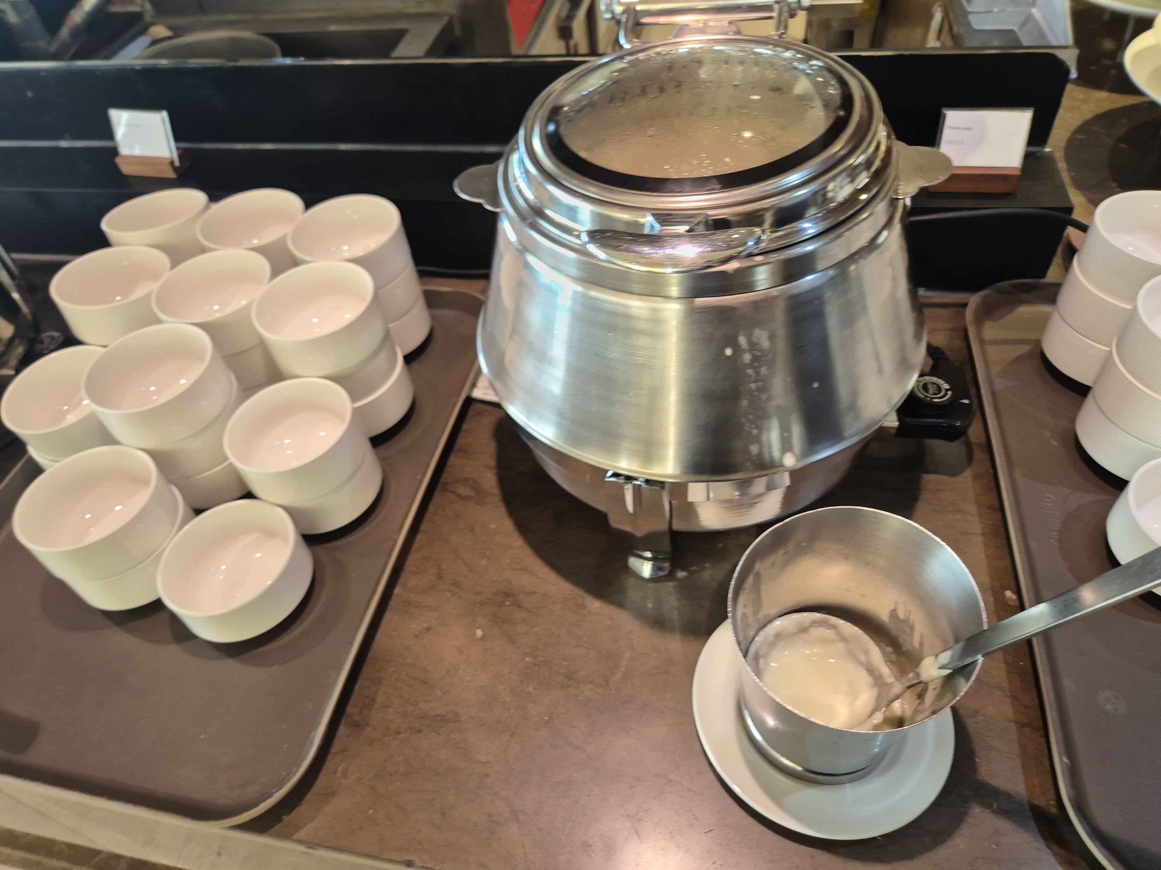 다들 늦게까지 얘기를 나누고 잠이 들었지만 일찍 깨신건지 조식당에서 다 만나버렸다..ㅋㅋ 조식당은 꼭대기층에 있어 전망이 좋긴 한데 우리는 여러 명이 같이 앉아야 하다 보니 저 구석자리에 앉았다. 그래도 메뉴는 다 찍어야겠다는 일념하에 사진부터 열심히 찍었다.