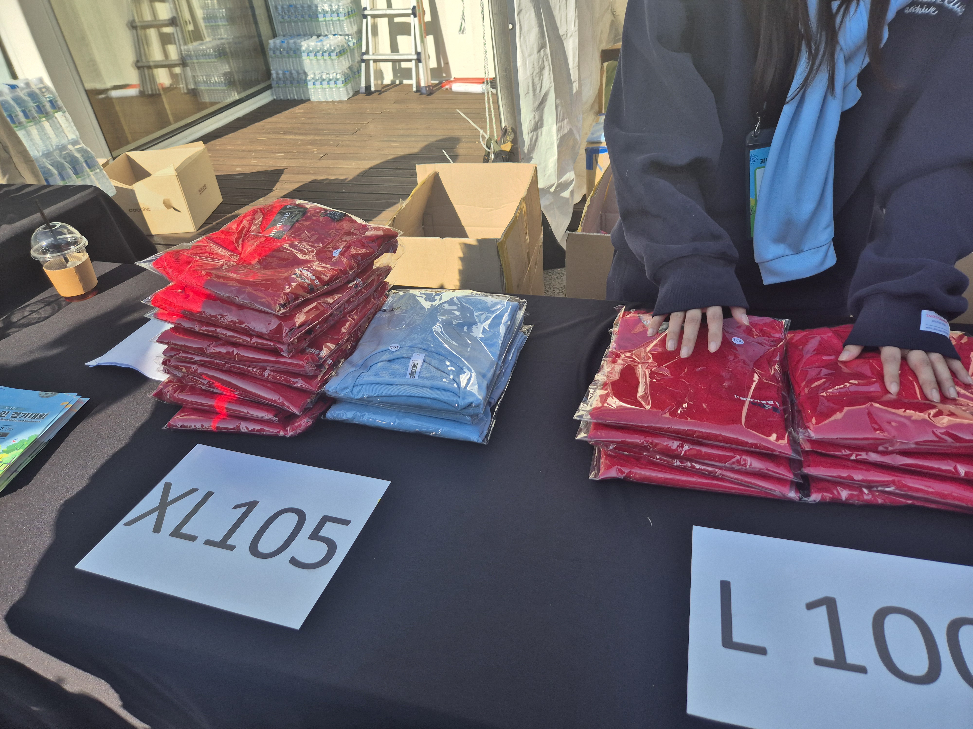 기념품으로 준 티셔츠...! 파란색 100 사이즈를 받고 싶었는데 이미 거덜이 나서.. 그냥 105로 선택!!