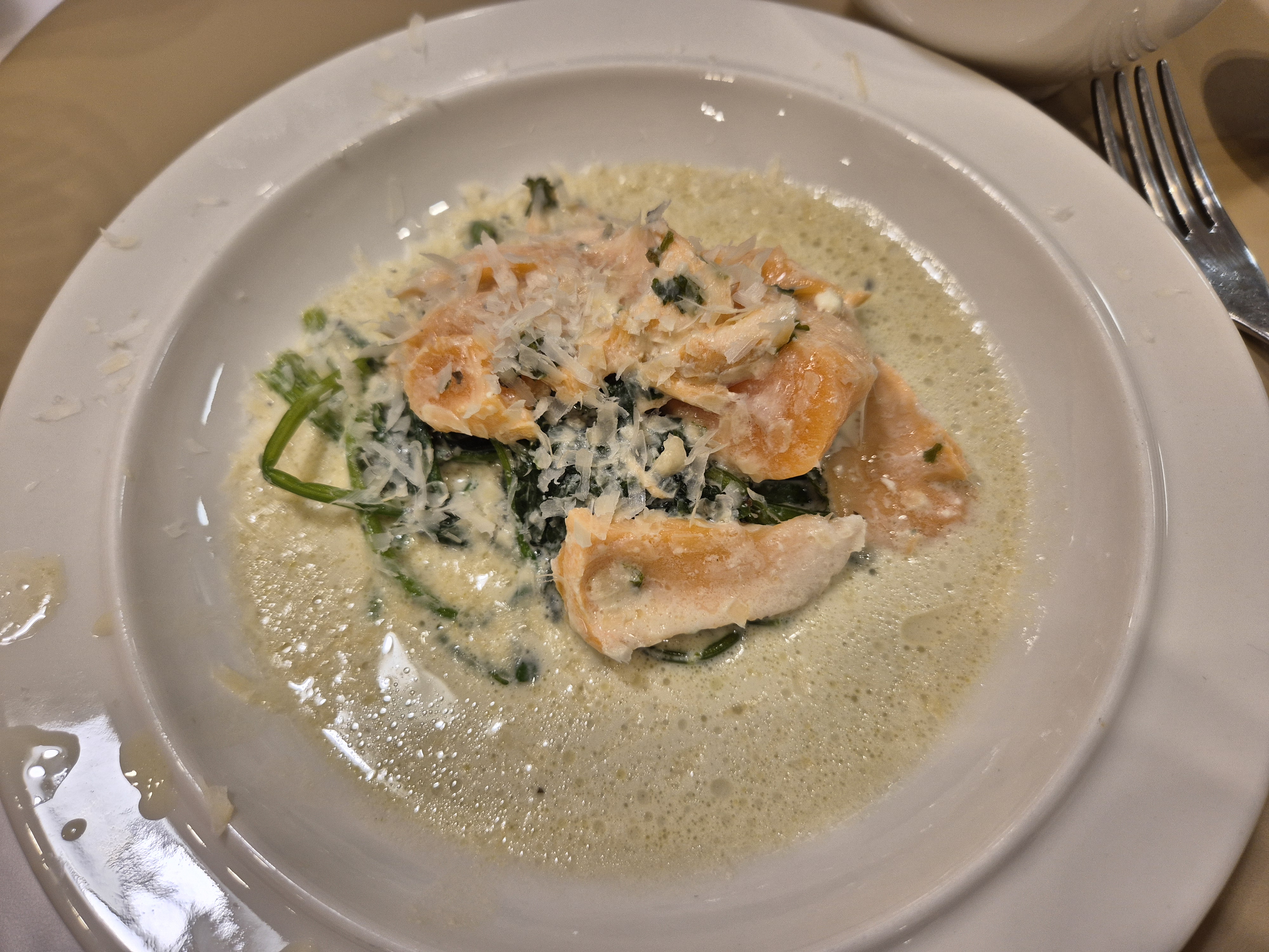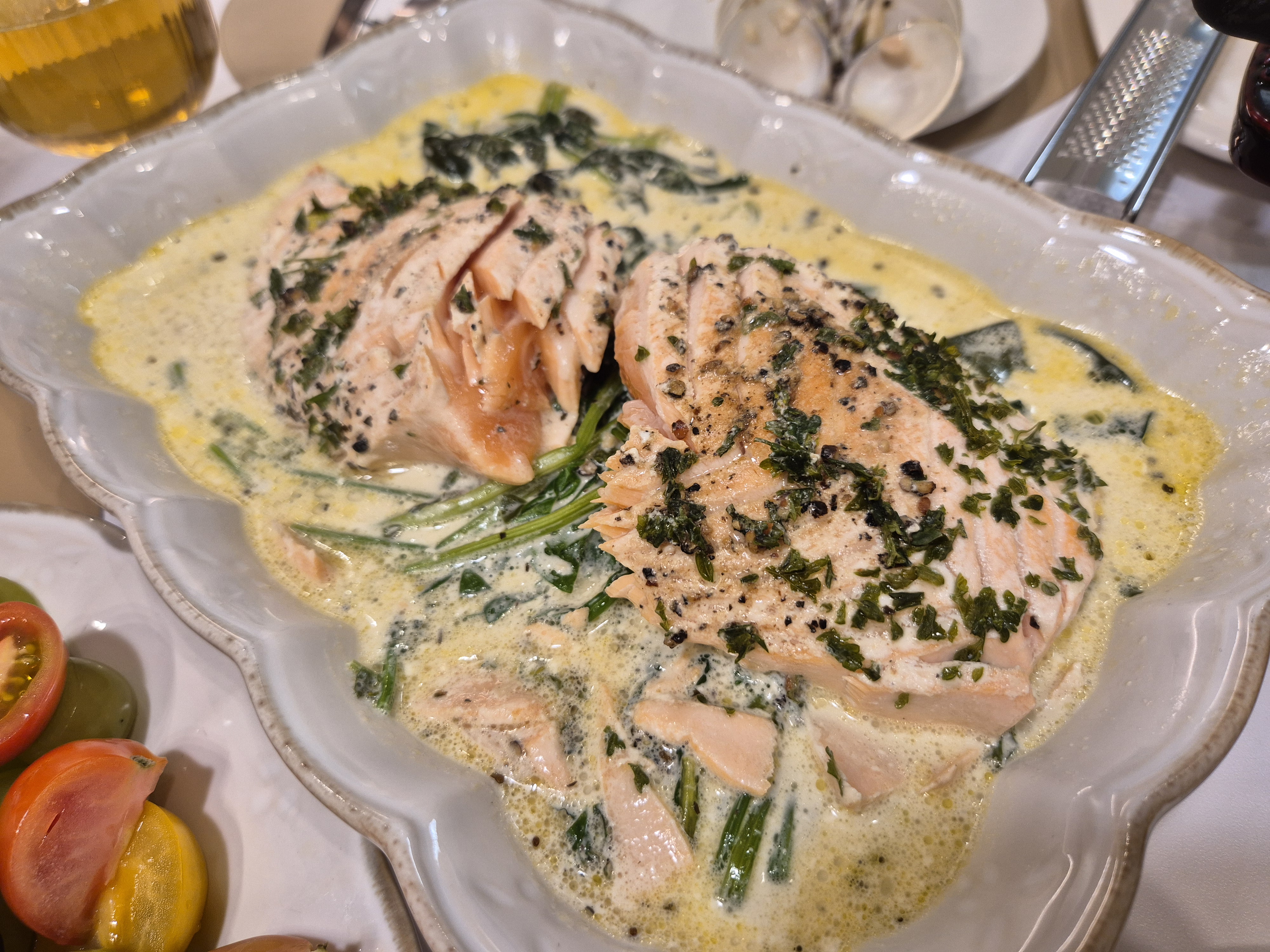예쁘게 플레이팅 해서 치즈도 솔솔솔 뿌려주었다. 연어의 익힘 정도가 훌륭했다. Even하지는 않았고 ㅋㅋㅋㅋ 참치 타다끼 먹는 느낌?? ㅋㅋㅋ ㅎㅎㅎ