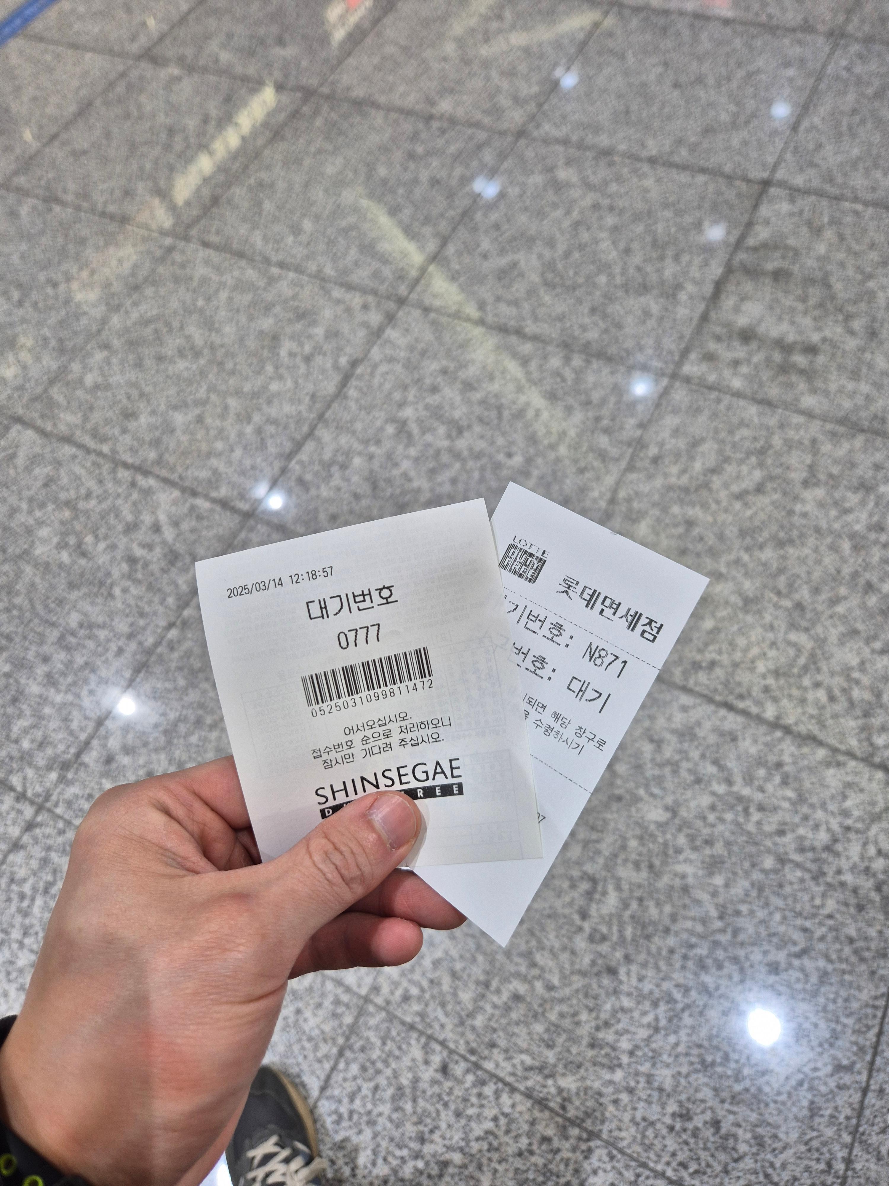 여행의 시작은 면세점 픽업부터 아닐까. 예전에는 면세점에서 뭐 사야 하나 했는데.. 요즘에는 뭔가 꾸준히 사가지고 가는 것 같다. 친구에게 줄 술 선물과 함께 내가 쓸 용품까지 픽업하러 공항면세점으로 향했다. 최저가를 찾다 보니 신세계와 롯데에서 하나씩 주문을..ㅋㅋㅋ 어라 그런데 신세계 번호가 777번이네! 신기해서 일단 찍어봄..ㅋㅋ 이날은 보안검사에도 대략 40분이 넘게 걸렸고 인터넷 면세점에서 주문을 픽업하는데도 10분은 기다린 것 같다...