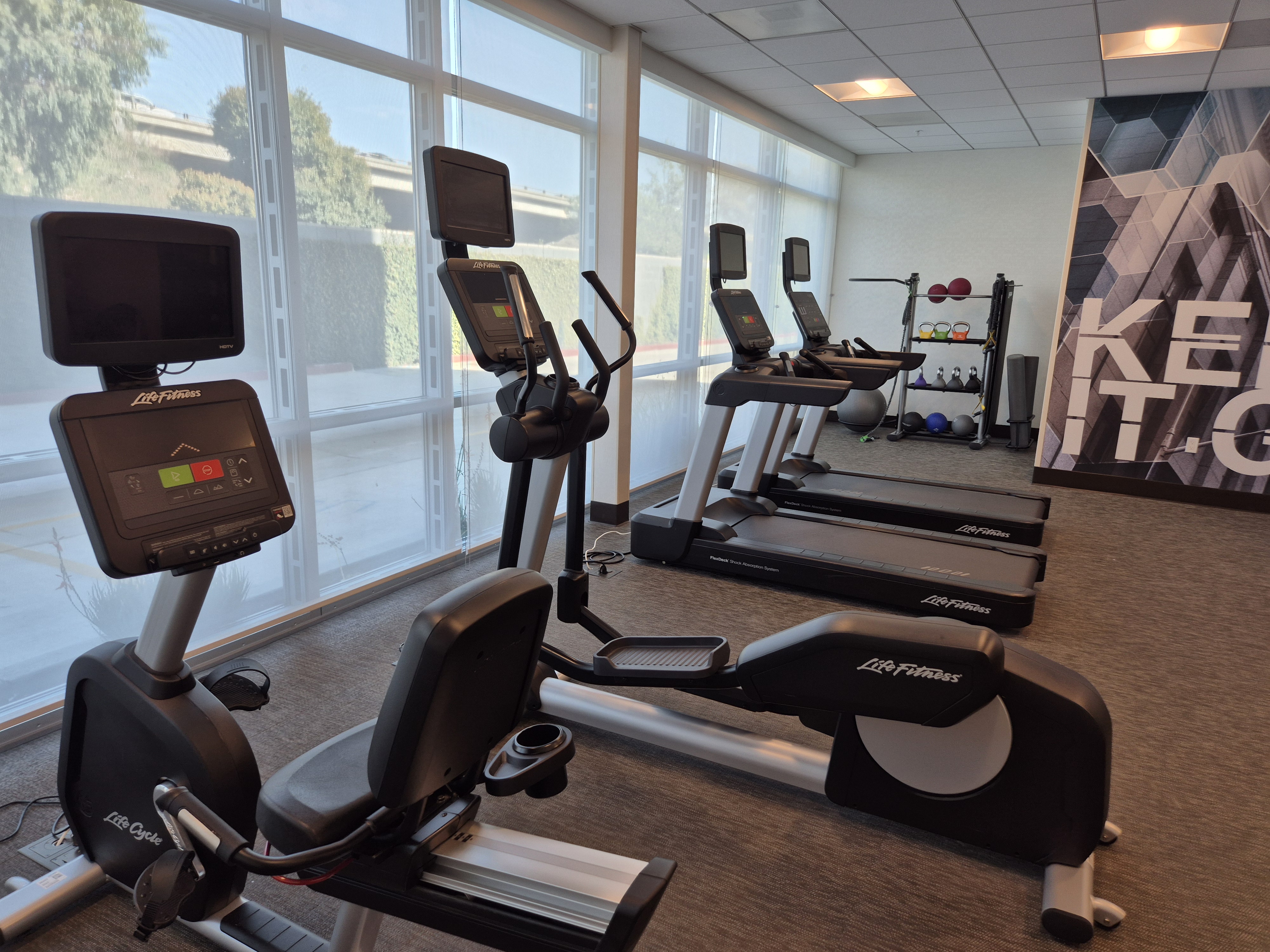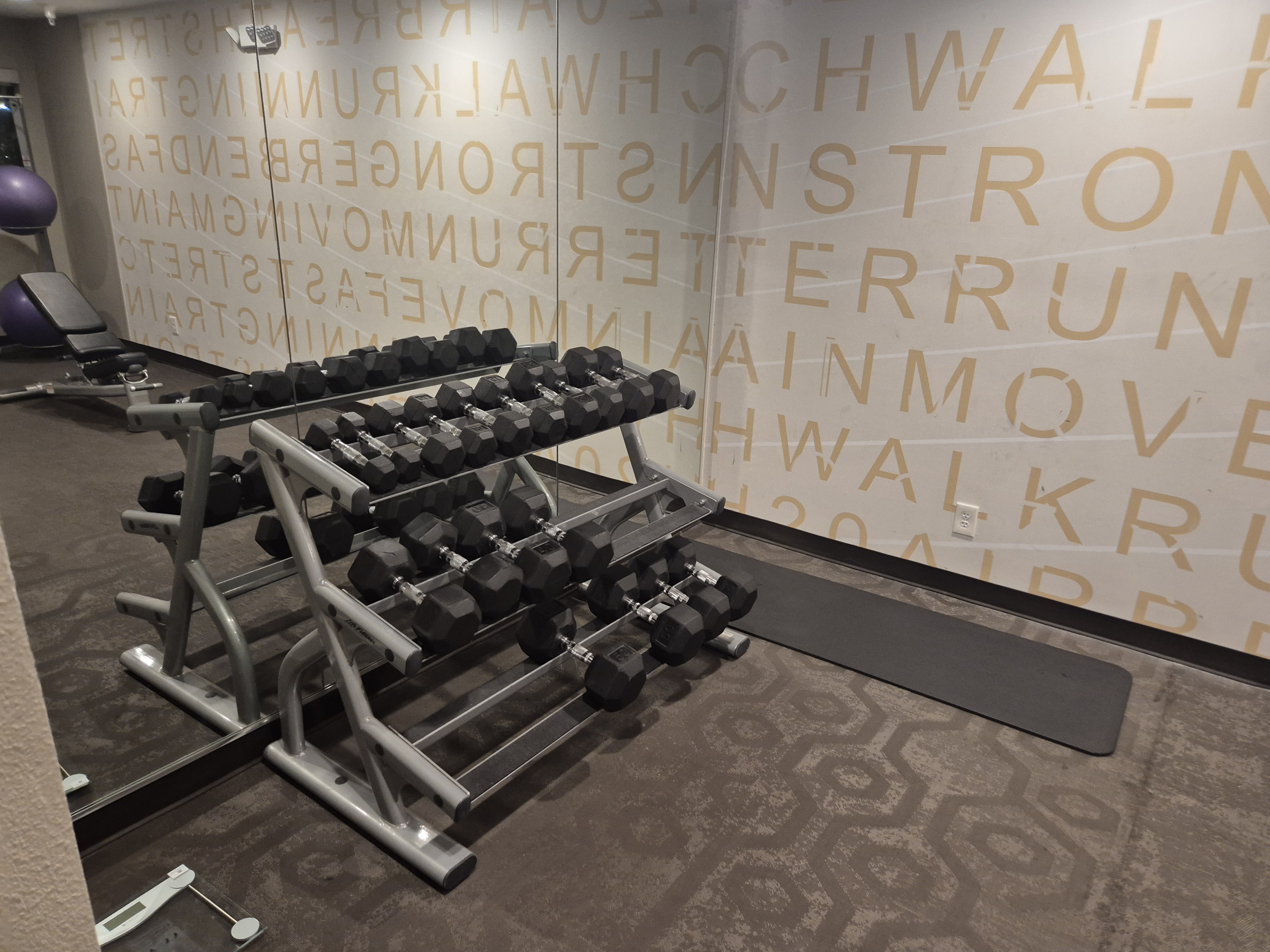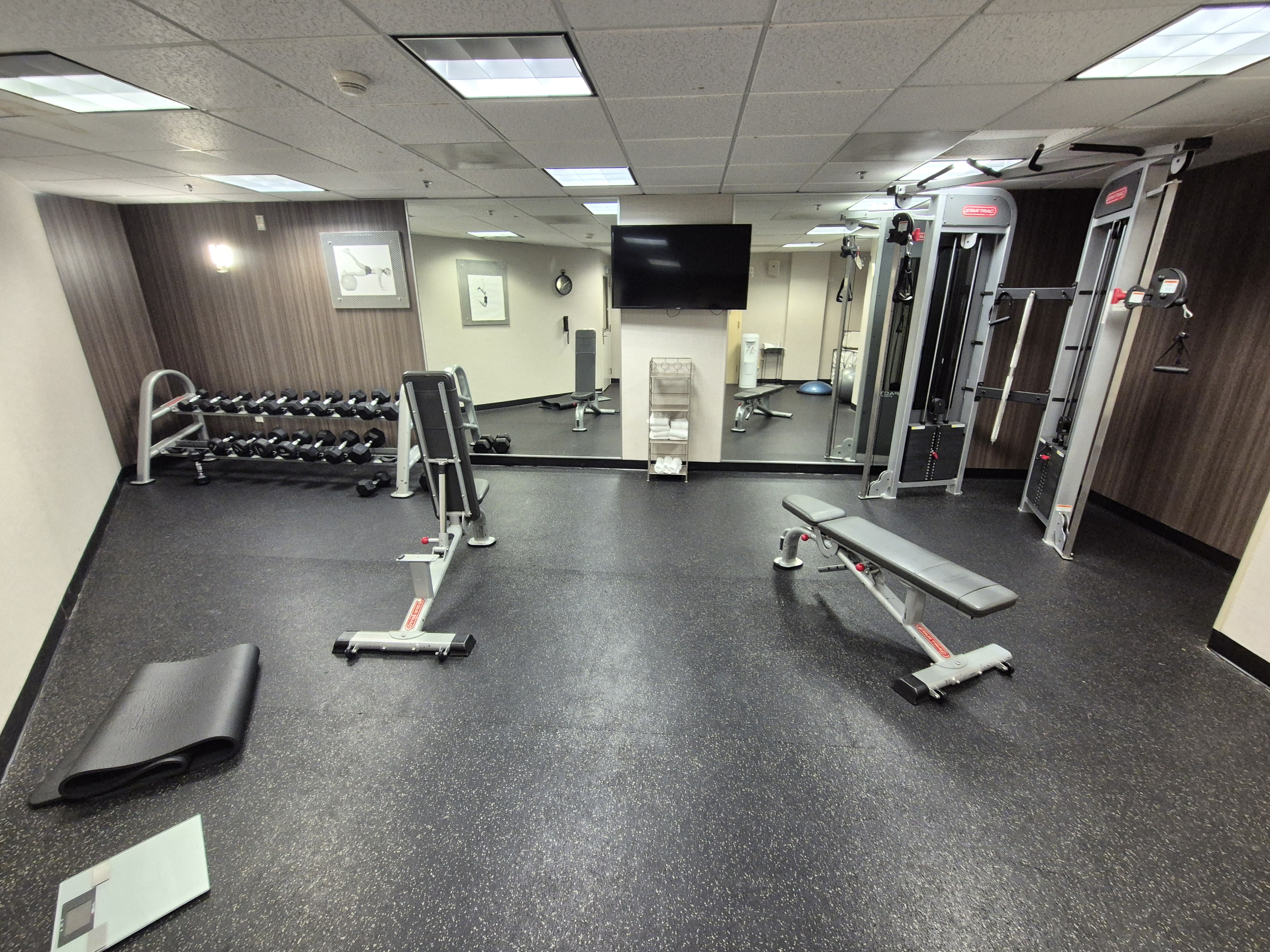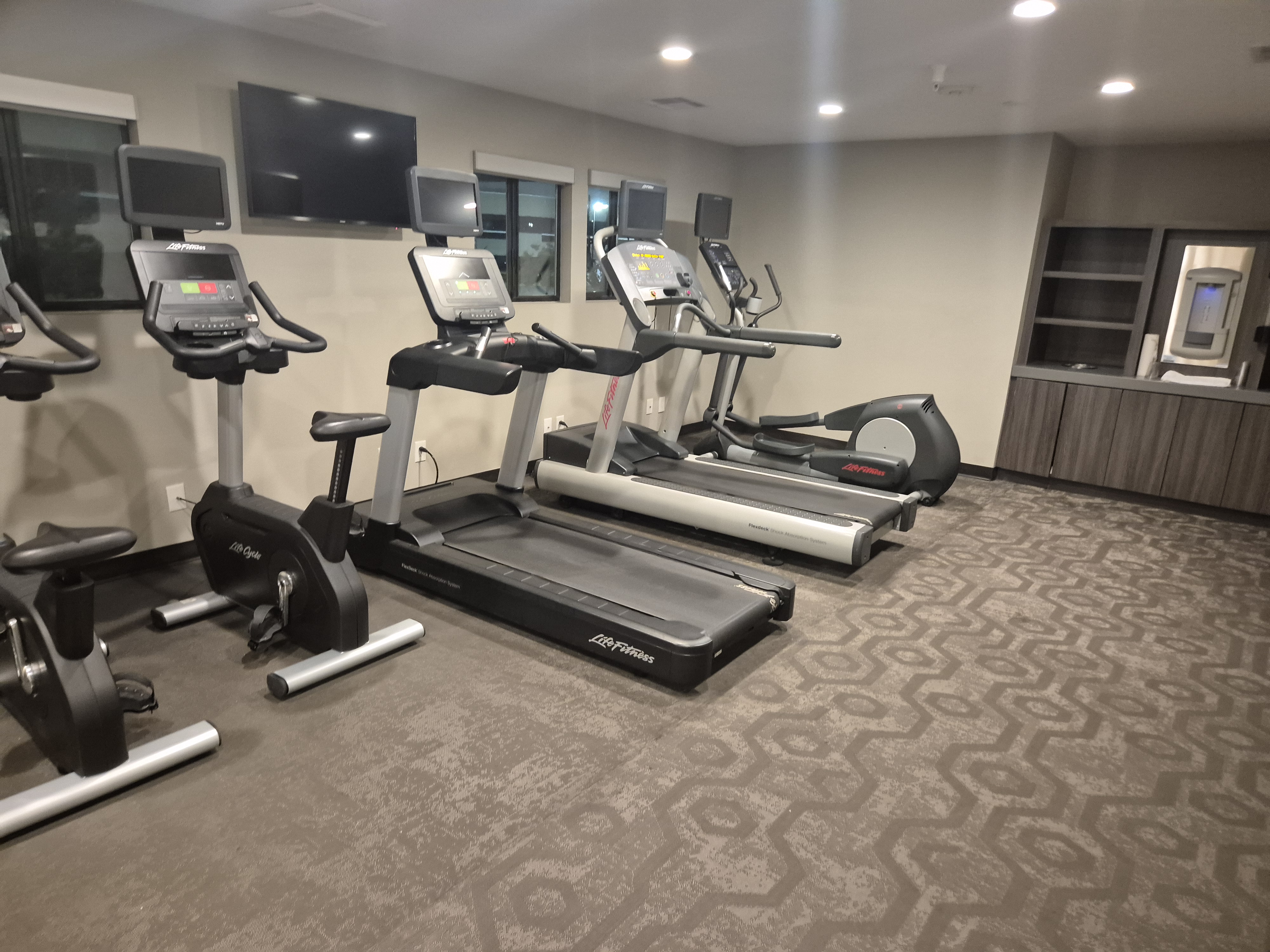 1층 엘베 바로 뒤편에 헬스장이 있어서 먼저 찍어봤다. 확실히 레지던스 인보다는 시설이 깔끔해 보였다.