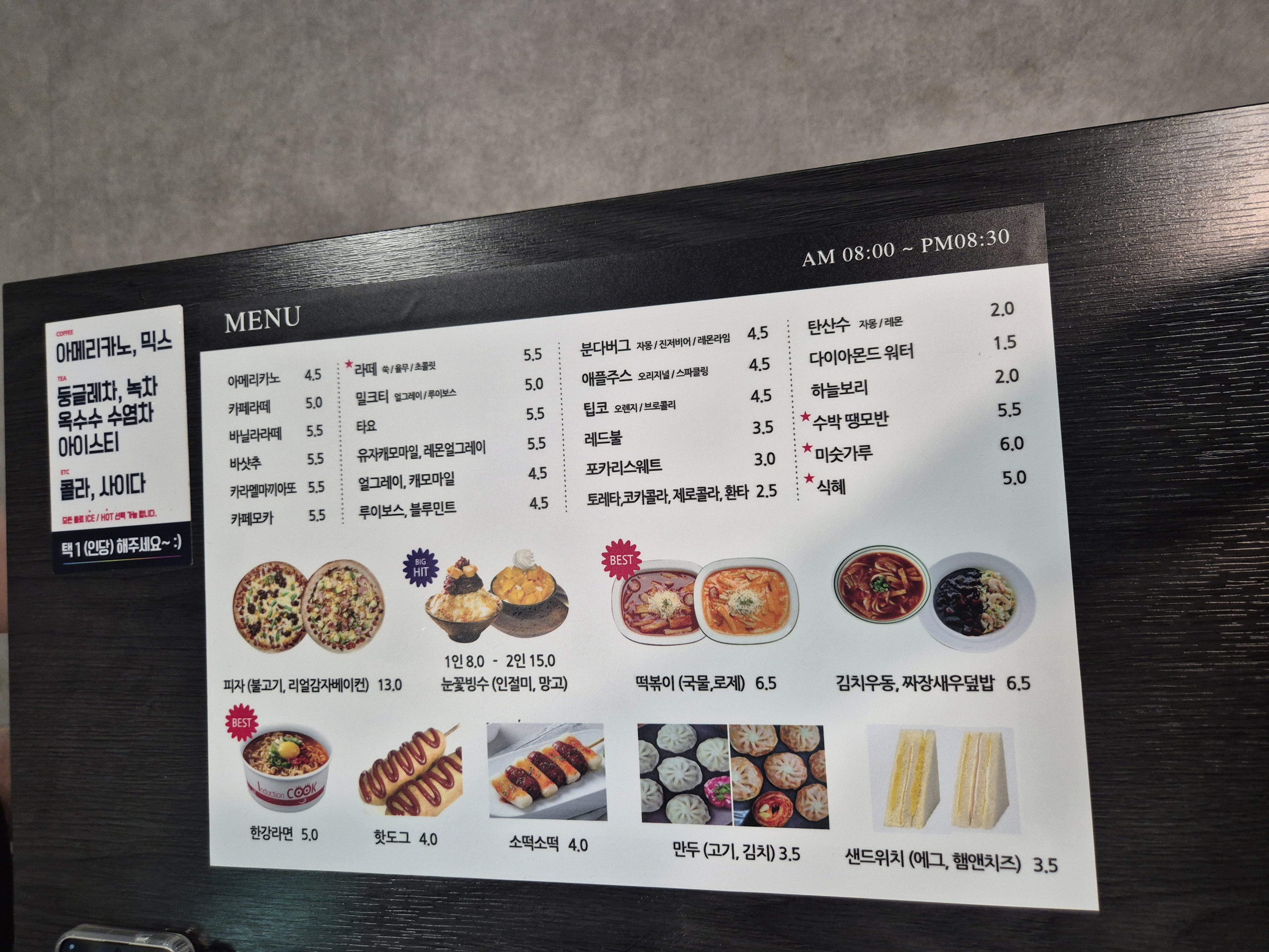 카페에서 판매하는 메뉴들인데.. 알고보니 이건 돈 내고 주문하는 거고 무료 음료는 왼쪽 끝에 붙어 있는 메뉴들만 된다..ㅋㅋㅋ 이미 우리는 당분이 높은 유자캐모마일/레몬얼그레이를 마셔서 옥수수수염차로 주문했다.