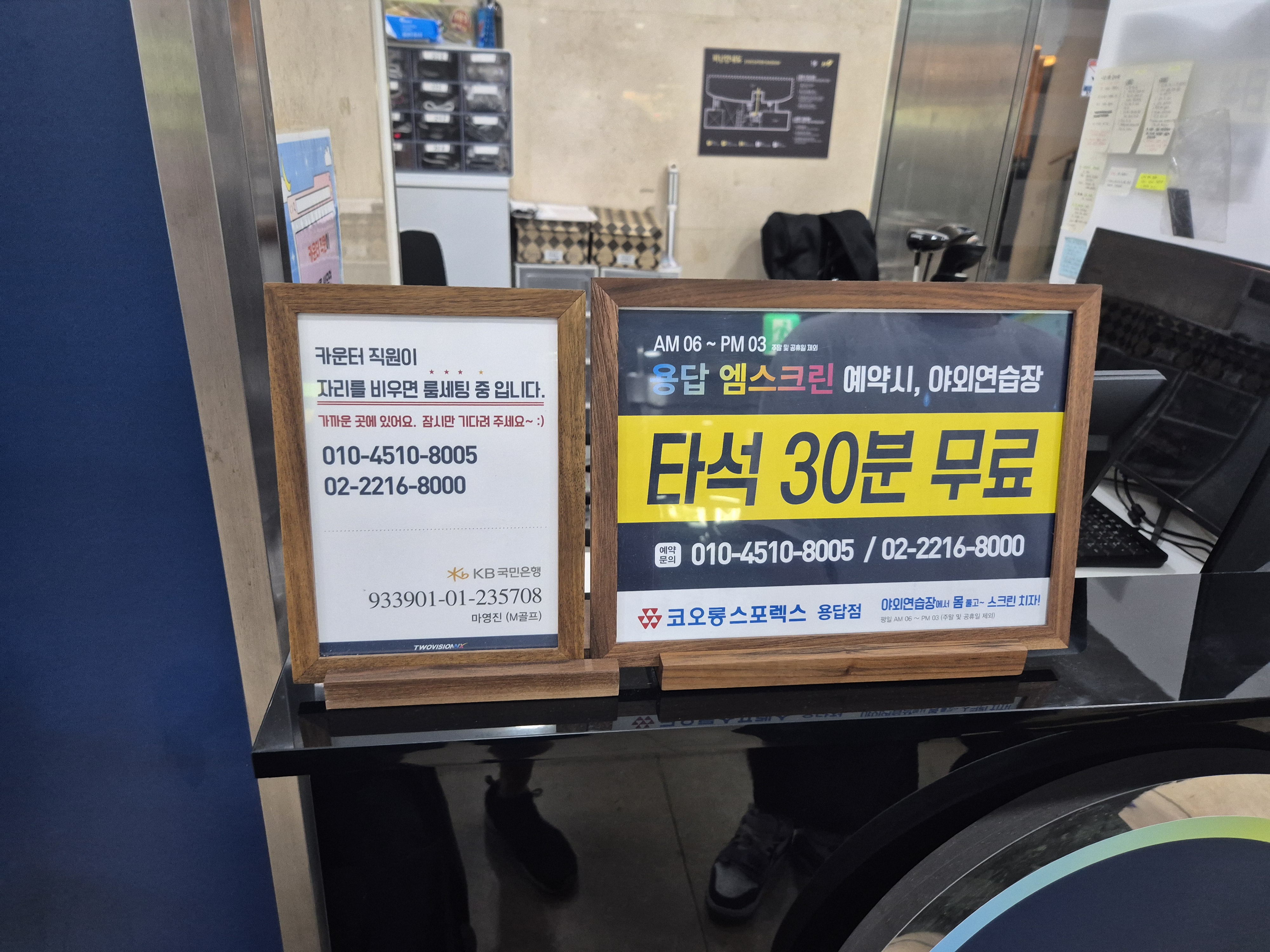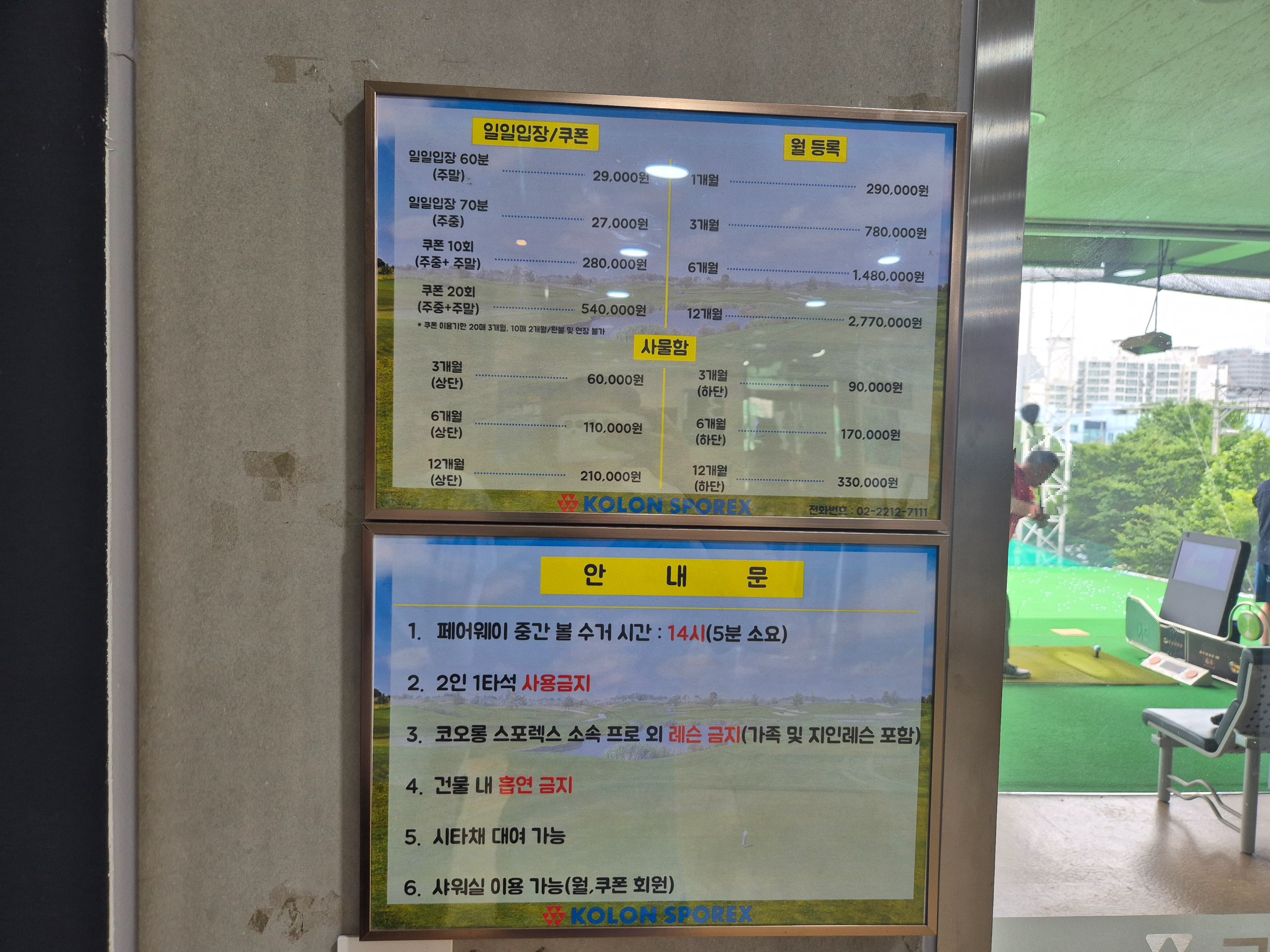 오 그럼 야외연습장에서 연습하면 되겠네 싶었는데.. 평일 6시~오후 3시에만 가능하다.. ㅠㅠㅠㅠ 참고로 스크린골프장과 야외 연습장은 다른 업체라고 한다..ㅎㅎ
