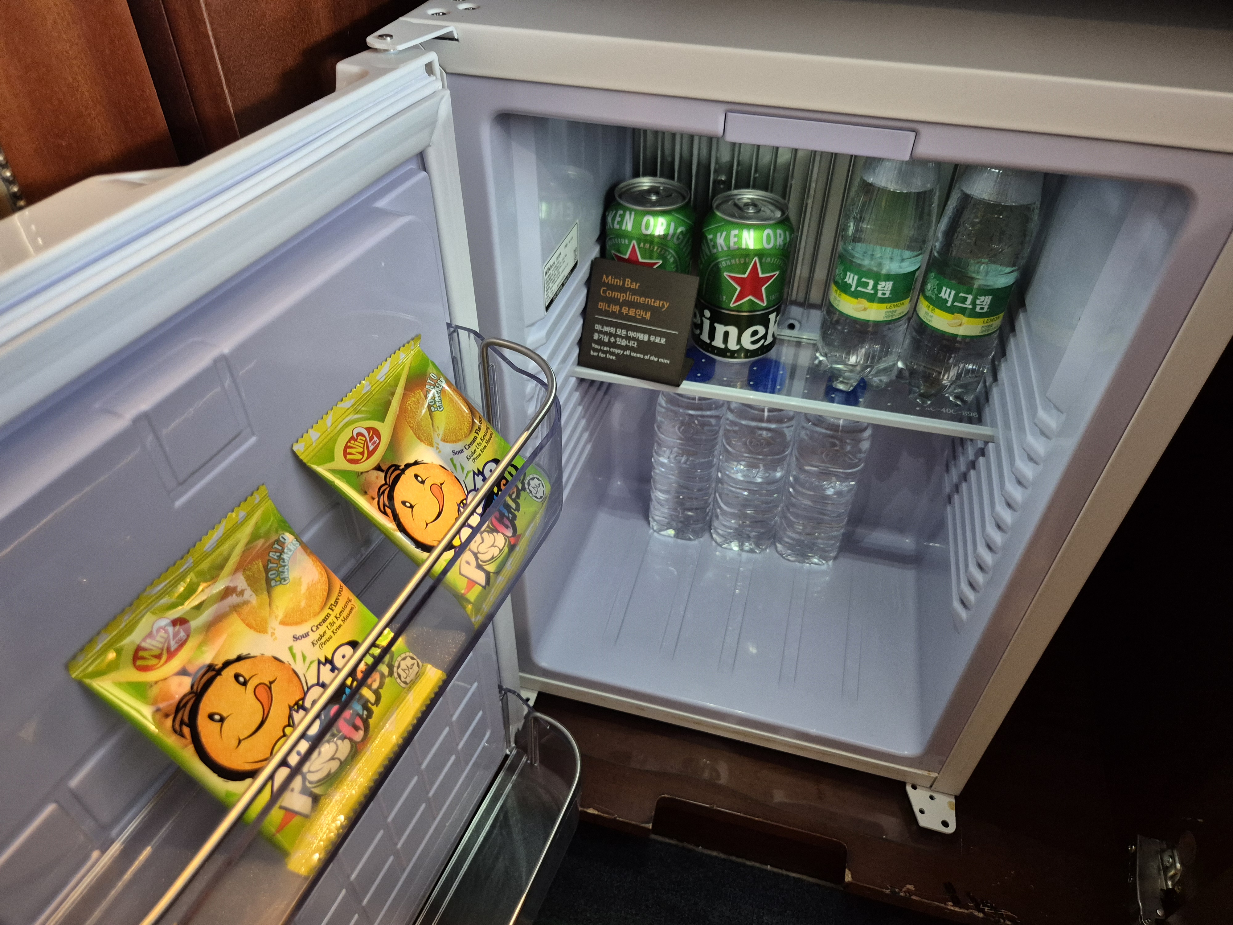 아 그리고 여기는 미니바가 무료다..!! 물 3병에 탄산수 2병, 맥주 2캔, 그리고 과자 2개!! 다음 날에도 딱 이만큼 더 채워주시더라..ㅎㅎ