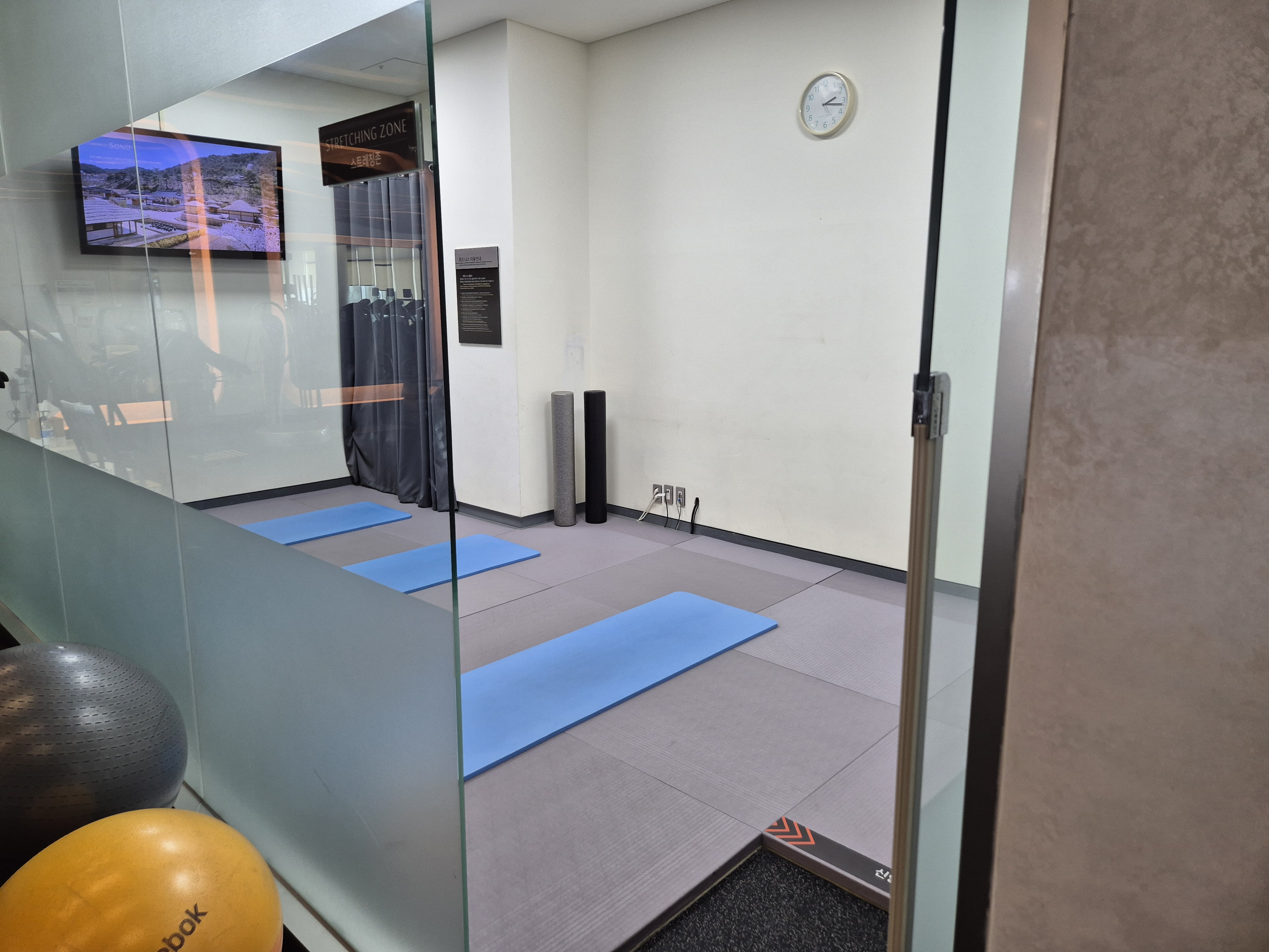 스트레칭실도 깔끔하게 마련되어 있는데 바닥이 조금 미끄러웠다.