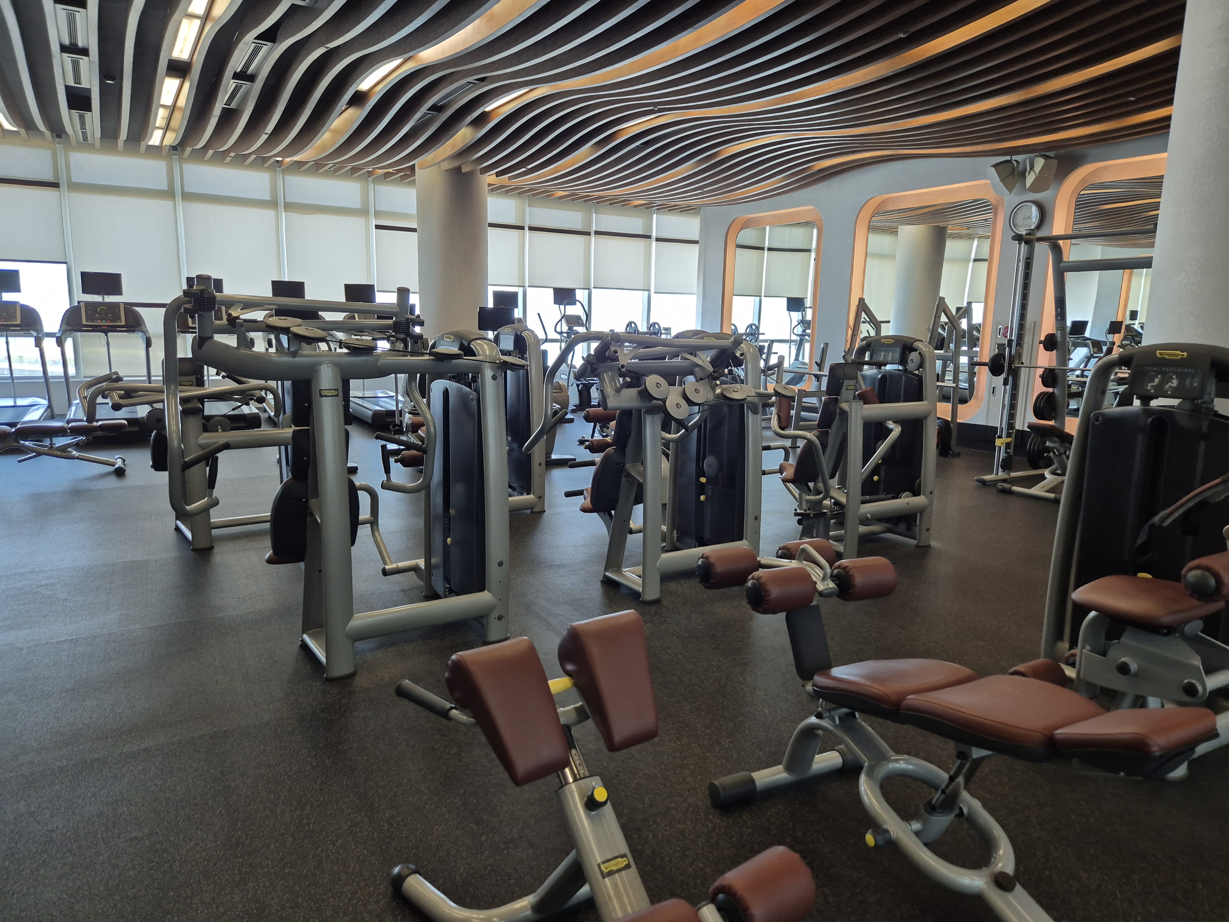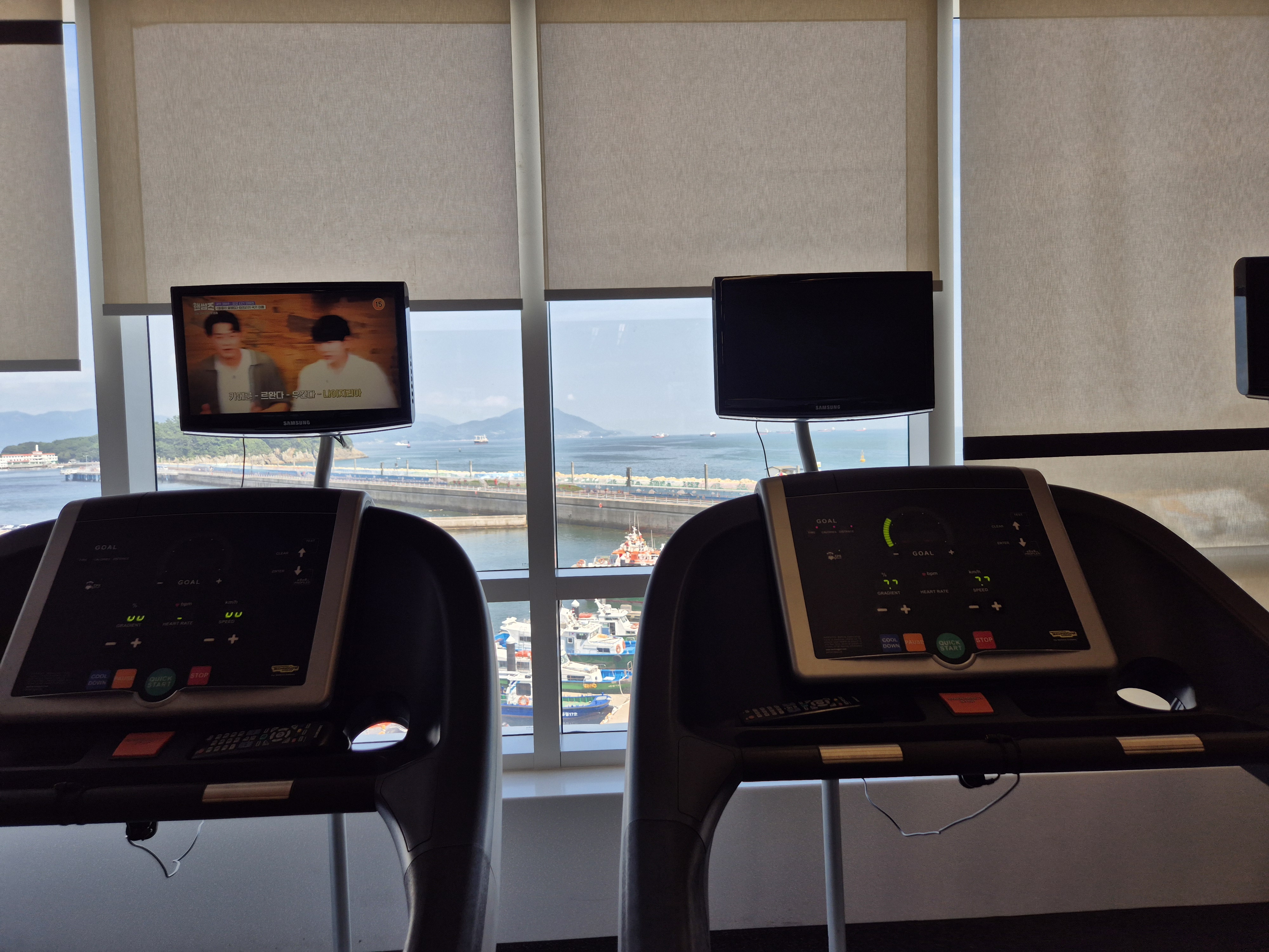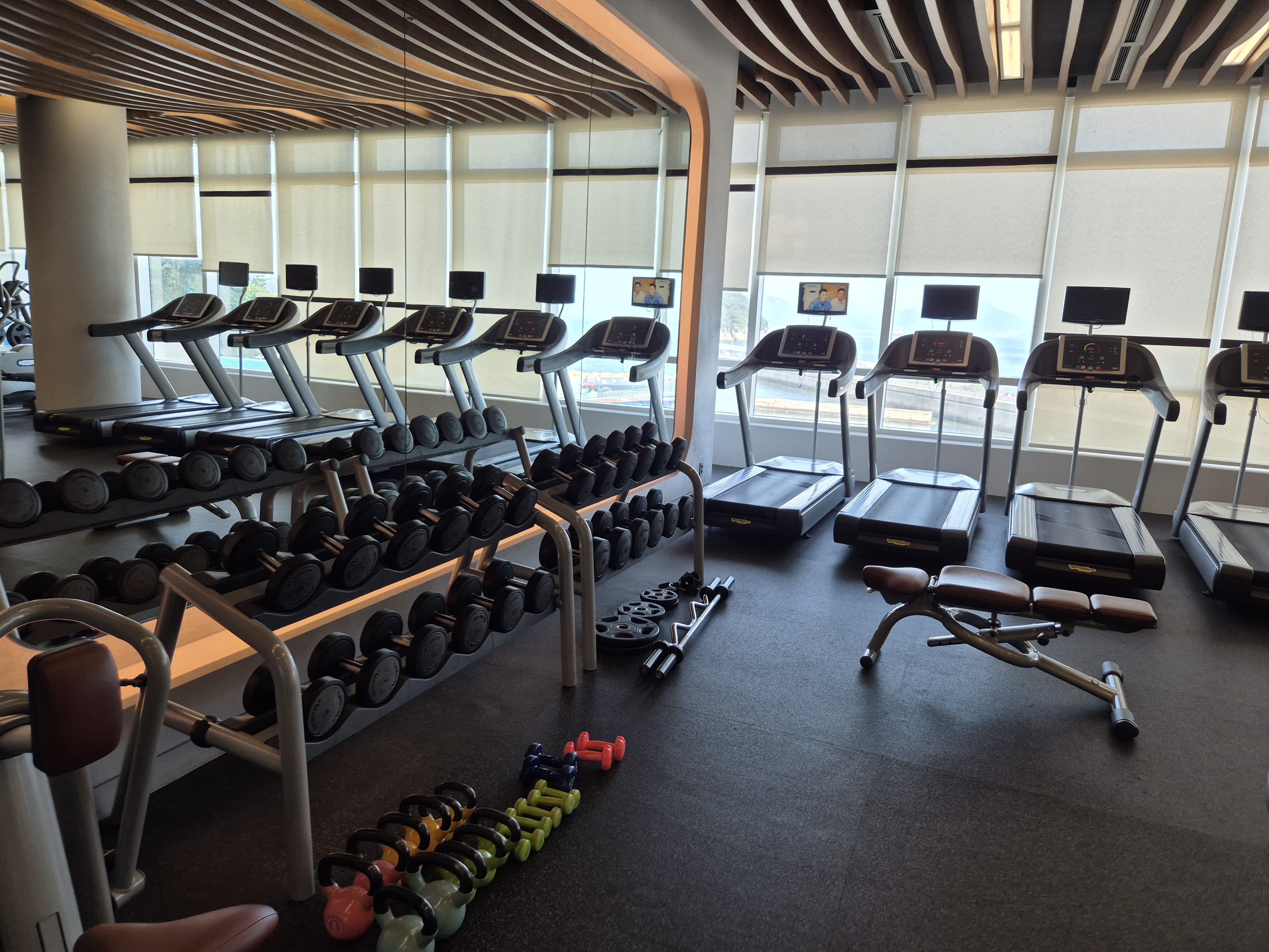 프리웨이트존과 바닷가를 보며 달릴 수 있는 러닝머신들..