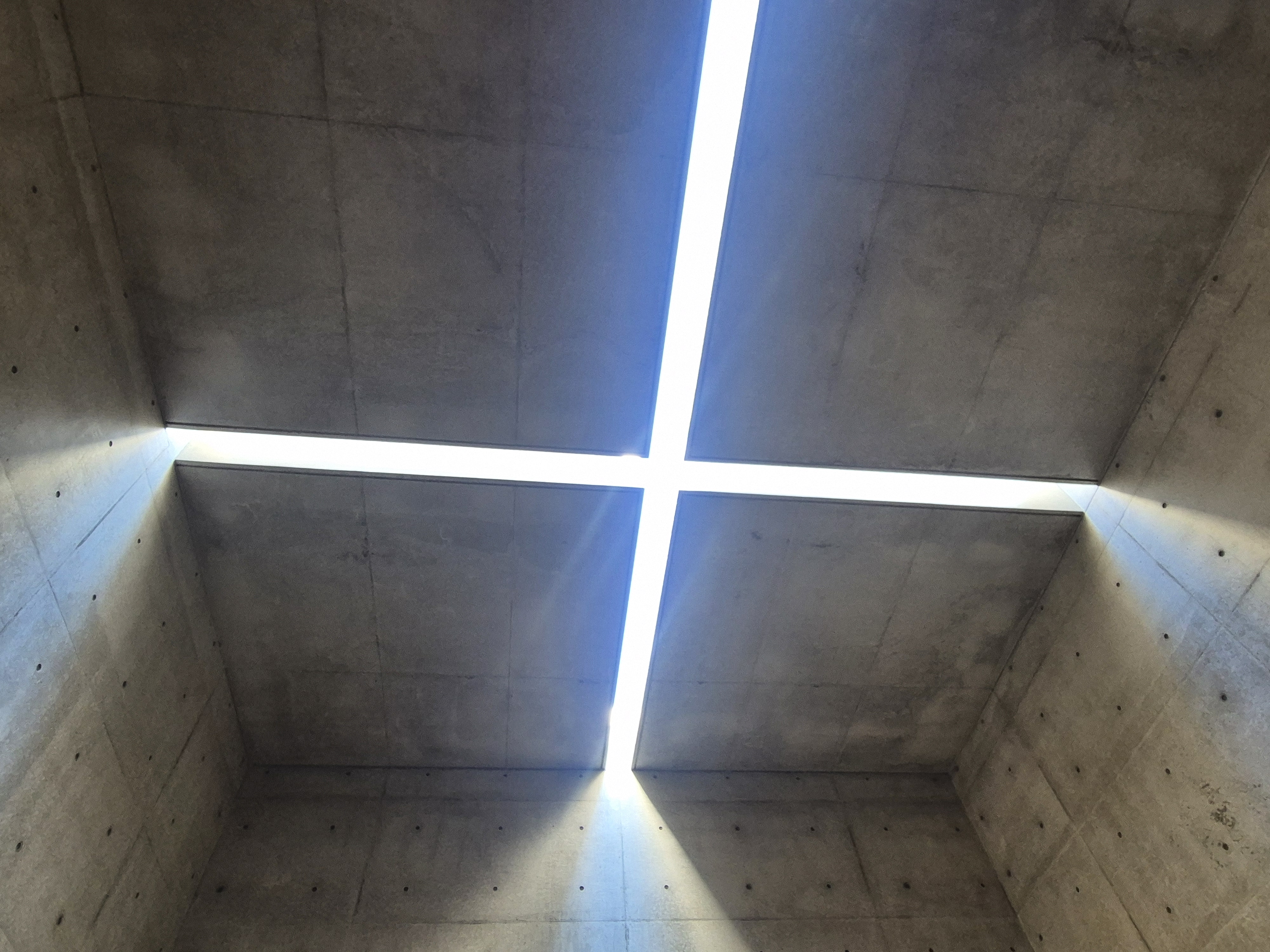 안도 타다오의 트레이드 마크가 모두 쓰인 공간이다. 구멍이 뽕뽕 뚫린 노출 콘크리트에 십자가 형상으로 빛이 들어온다.