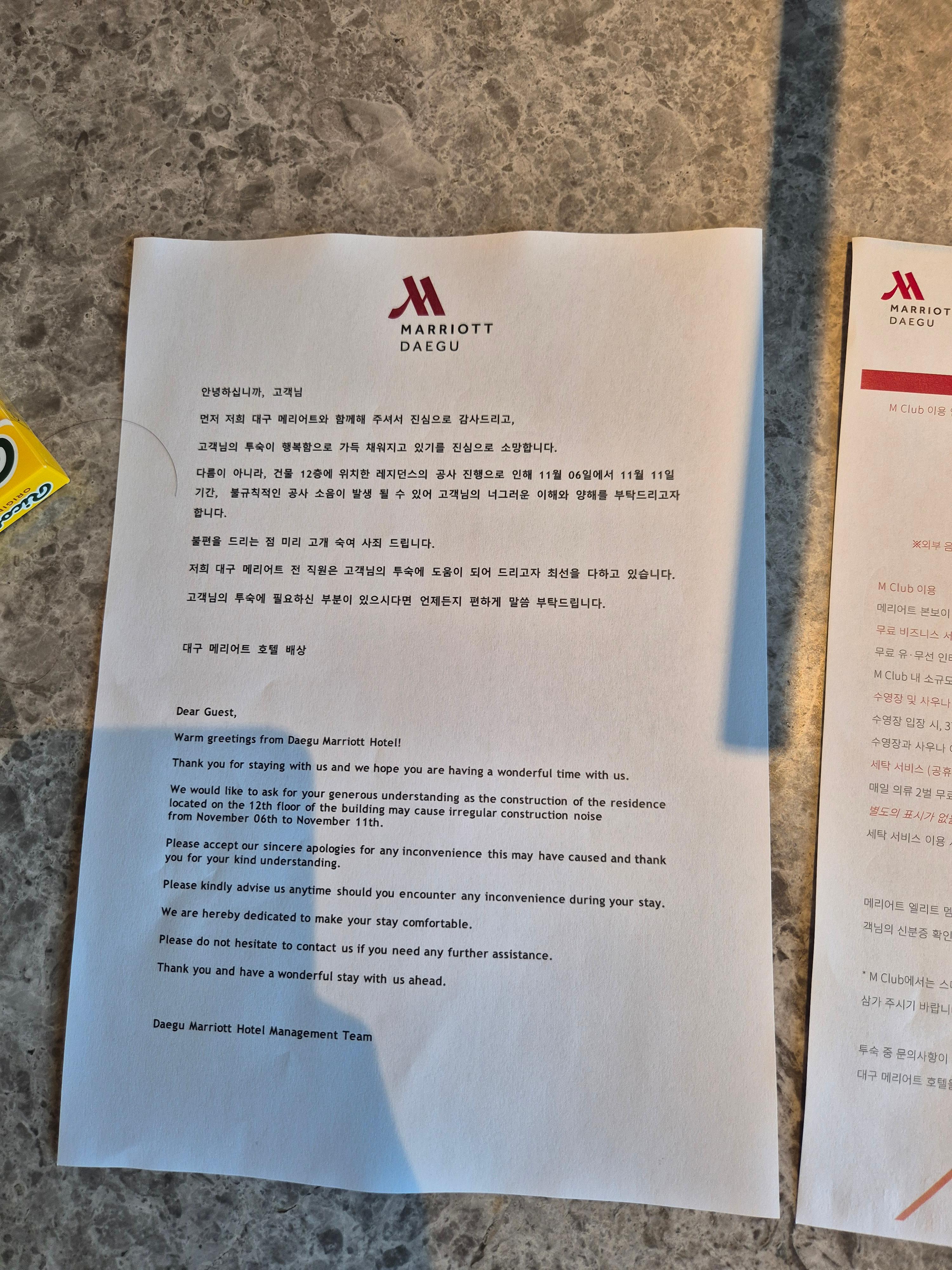 오랜만에 메리어트 플랫 티어를 다시 획득하여 머물게 되었는데 안타깝지만 룸 업그레이드는 없더라..ㅠㅠ 그래도 레이트 체크아웃을 받기는 했다. 흠 레이트 체크아웃을 포기하였으면 룸 업그레이드를 받았을까.