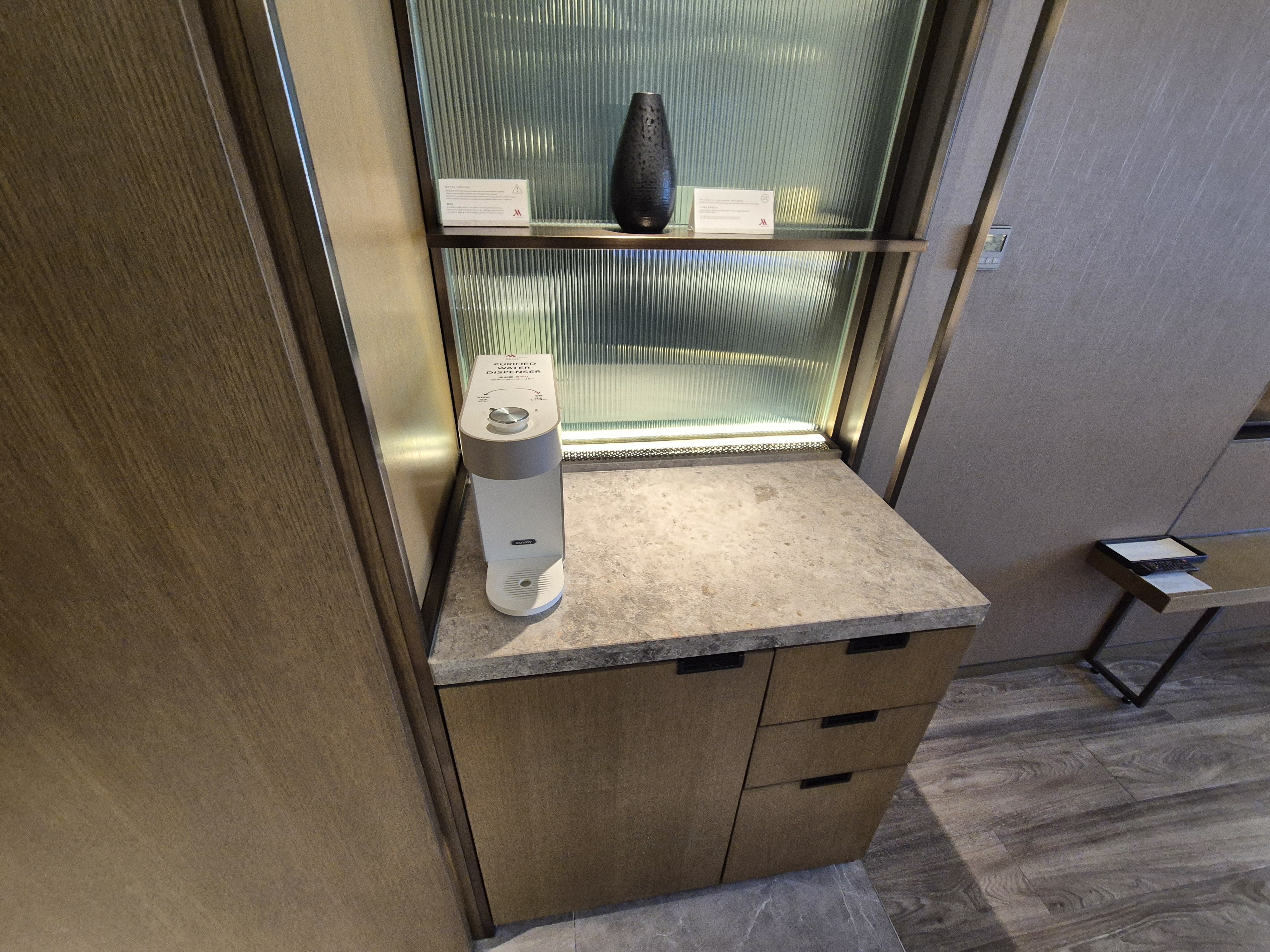 그래도 정수기 덕에 물은 한없이 마실 수 있어 좋았다. 아 참고로 아래 서랍장에 티팟이 있어서 따뜻한 물도 무제한으로 마실 수 있다..!! 기침을 좀 심하게 하고 있어서 따뜻한 물도 무한으로 마셨다..ㅎㅎ