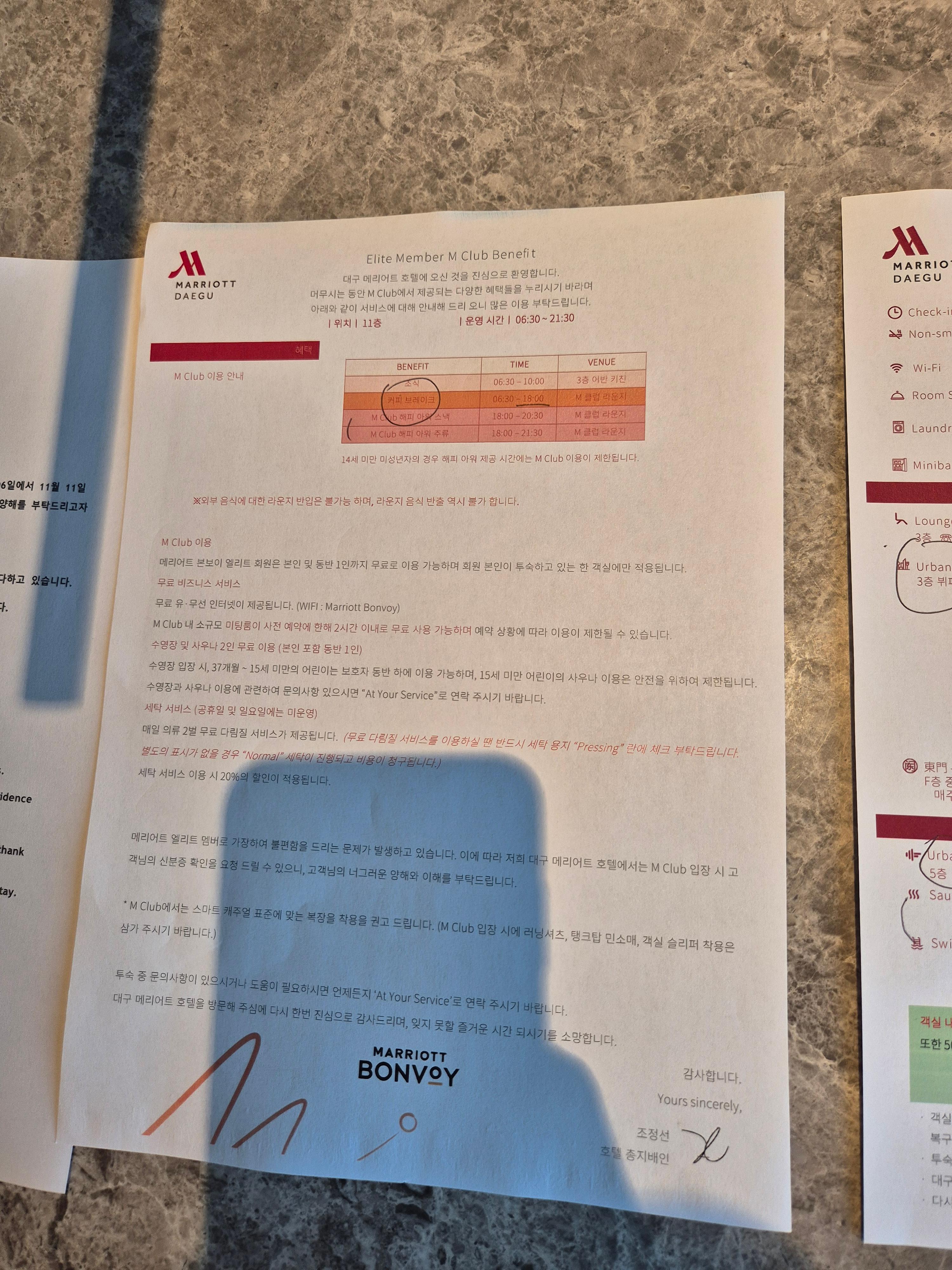 조식은 3층의 Urban Kitchen에서 먹을 수 있는데 이건 다른 블로그에서 소개할 예정이다..ㅎㅎ 여하튼 가격이 좀 높긴 하지만 플랫 티어를 받고 간다면 이것저것 누릴 수 있는 혜택이 많긴 한 것 같다. 내년도에도 열심히 메리어트 계열 호텔을 다녀야겠다 싶더라..ㅋㅋ 라이프타임 플랫까지 이제 5년만 버티면 되니까..!! ㅠㅠ