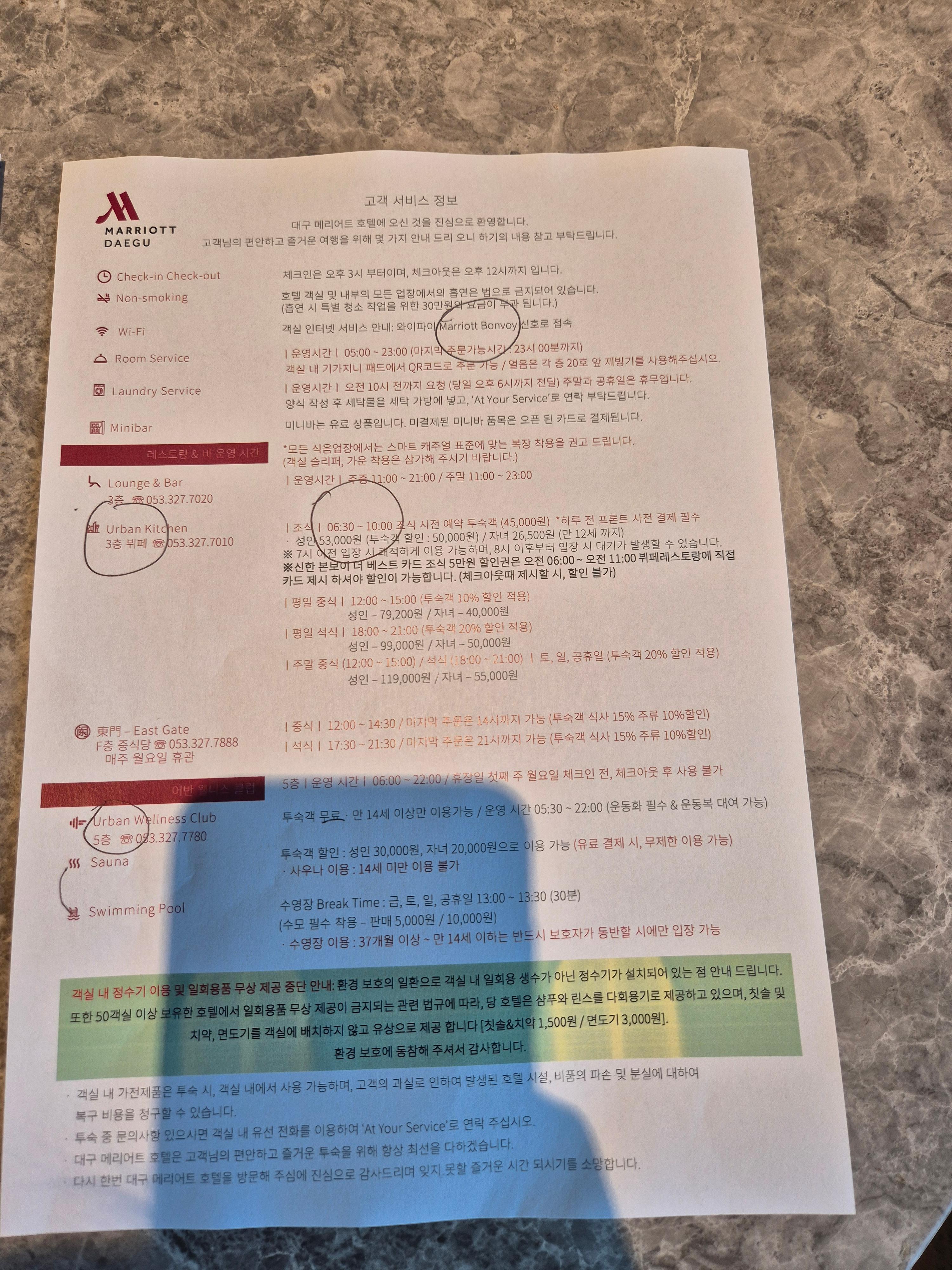 일단 Urban Kitchen에서의 조식 2인이 무료다! 1인에 53,000원짜리인데 사전 예약을 하면 45,000원이고 투숙객 할인을 하면 50,000원으로 신한 본보이 더 베스트 카드 조식 5만 원 할인권을 사용할 때 안성맞춤이긴 하다. 갑자기 플랫이 되어서 쬐금 아쉽구만..ㅎㅎ 헬스장은 5시 30분부터 운영되는구만..!! 수영장과 사우나는 6시부터인 것 같다. 플랫 멤버는 수영장과 사우나도 하루에 1번은 무료라고 한다..!! ㅋㅋㅋ 그래서 욕조가 없는 대신 매일 목욕을 하러 갔다..ㅋㅋㅋ